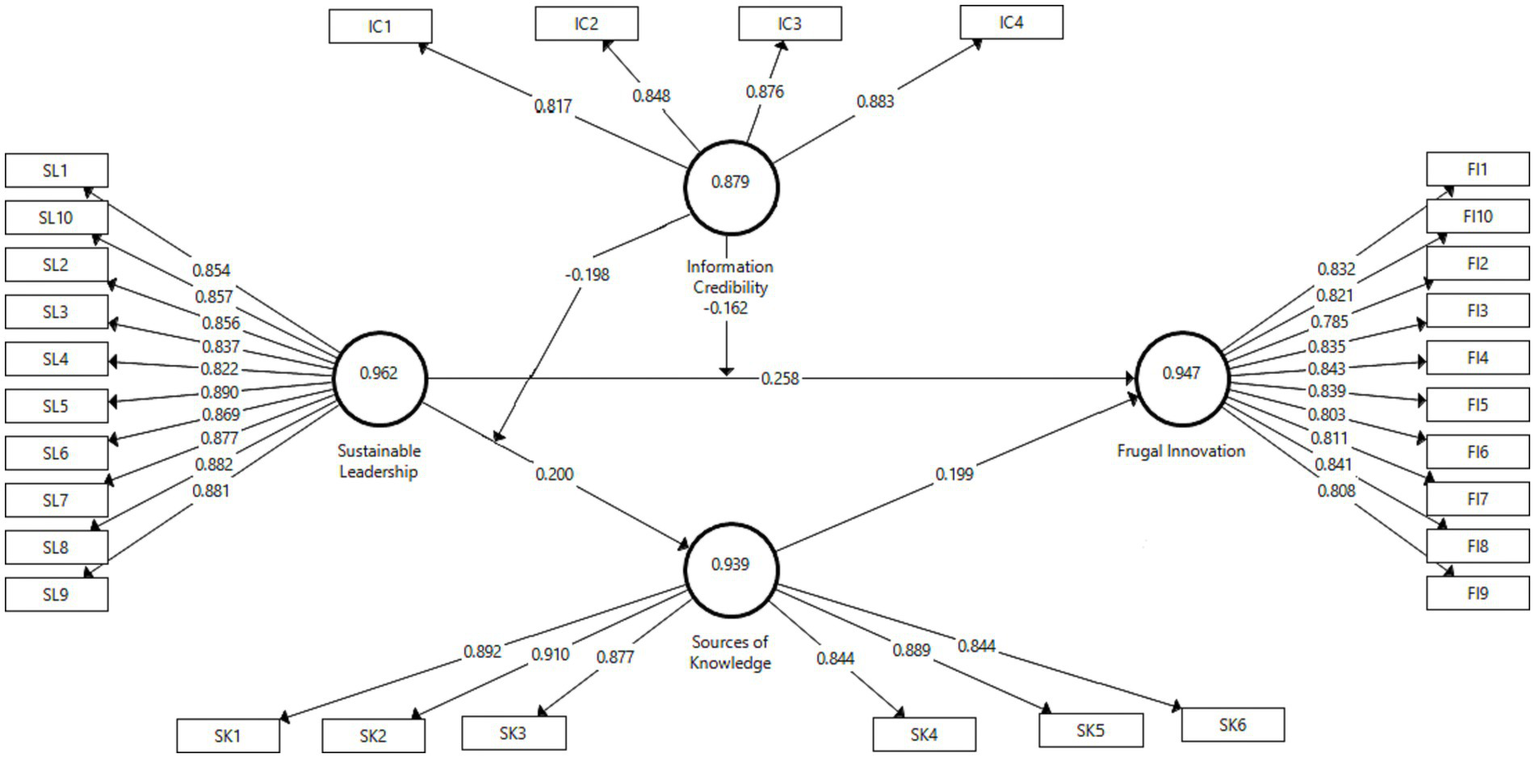 Taking into consideration the moderating effect of information credibility and the mediating effect of knowledge sources, this study’s main goal was to examine the impact of sustainable leadership on frugal innovation through Businesses in Pakistan. This study used a cross-sectional design so data was gathered through the use of a quantitative research technique and surveys. Data analysis was performed using PLS-SEM. The targted respondents of this research were the employees of SMEs in Pakistan who were involved in the production of services or goods. The inclusion criteria were as follows: (i) the participants should be currently employed in an SME, (ii) they should have a minimum of 1 year of work experience, and (iii) they must be willing to take part in the research. Participants who were recruited for the research but did not fulfil the eligibility requirements were not included. Additionally, seven incomplete questionnaires and responses with missing data were also excluded from the analysis.