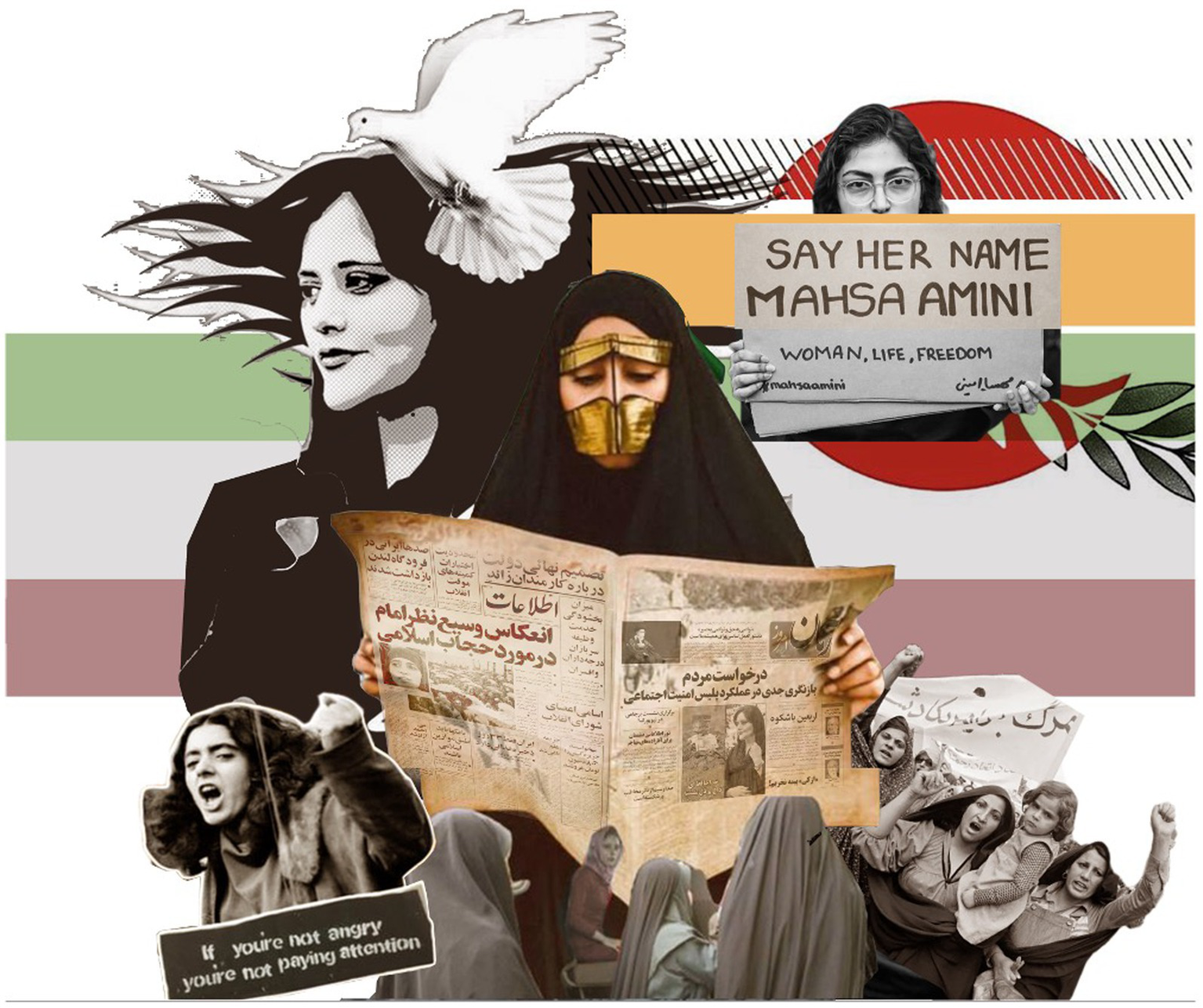 A collage of defiance and peace: a juxtaposition of women’s activism and symbolism in ‘Woman, Life, Freedom’ Movement with layered images of protest, hashtags, cultural elements, and a call for freedom. Sources: Karla D. Hernandez and Tahseen Reza Anika, 2023.