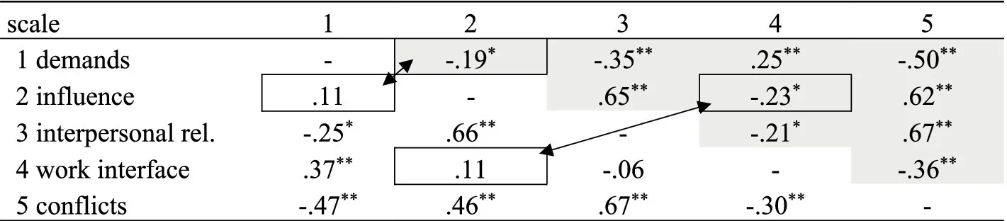 Comparisons made between two correlation coefficients using Fisher’s r-to-z transformation were additionally used to elicit and contrast the difference in correlation strengths in the two groups. Accordingly, there was a significant difference in the magnitude of the correlations for demands and influence 21–21, z = −2.04, p 0.041* (two-tailed) and work interface and influence 42–42 z = −2.30, p 0.021*. Negative relations were found for persons without personnel responsibility and positive relations for persons with personnel responsibility. This means that persons with personnel responsibility have correspondingly low values on the influence scale for the positively coded demands scale and vice versa. This pattern does not apply to persons without personnel responsibility: The response behavior shows that negative influence can occur simultaneously with high positive demands. This pattern is analogous for work interface and influence.