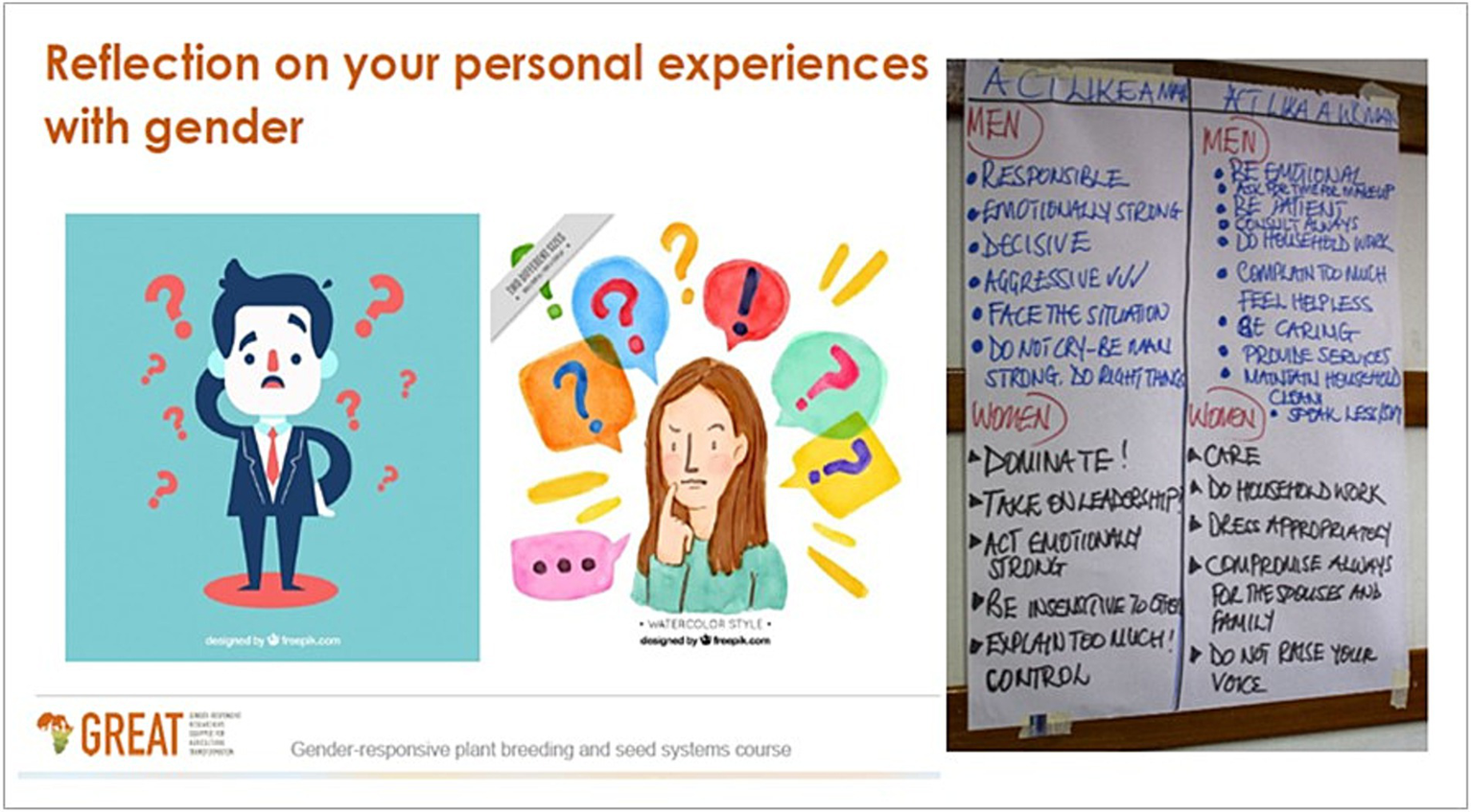 When GREAT introduced training programmes for agricultural researchers and practitioners through a feminist lens, its motive was to offer a comprehensive, trainee-centered, critical, interdisciplinary, and practical gender training course. The training course would provide a space for reflection on internalized gender beliefs, biases, and identities and foster gender transformation (Mangheni et al., 2019). While the training course set out to critique unequal gender power relations in agricultural research, it did not originally deliberately set out to interrogate notions of masculinities and their implication on the journey of transformation.
