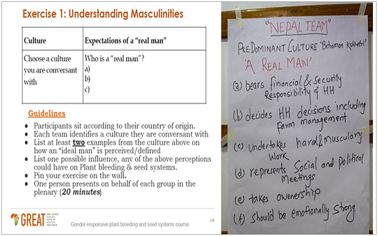 The concept of masculinities was always linked to the theme of training (e.g., plant breeding and seed systems for Case 1 and agronomy for Case 2), and the cultures of the regions hosting the training (South Asia and Sub-Saharan Africa respectively). In terms of delivery, these sessions were equally participatory, culturally rooted, and gave freedom to the participants to learn from each other and their environments.