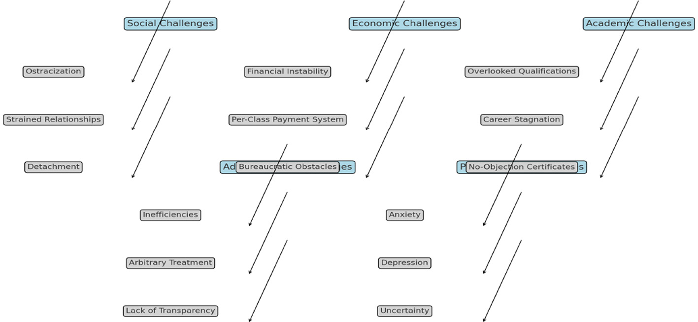 In KP, daily wage teachers face similar financial hardships. Payment structures based on per-class remuneration fail to provide economic stability or meet basic living expenses. Delays in reimbursement, a common issue in Pakistani universities, further exacerbate these challenges (Ali, 2018; Ang, 2018). These financial instabilities often force educators into precarious living conditions. While these economic issues align with global trends, the interplay of local bureaucratic inefficiencies in KP with these challenges warrants deeper investigation.