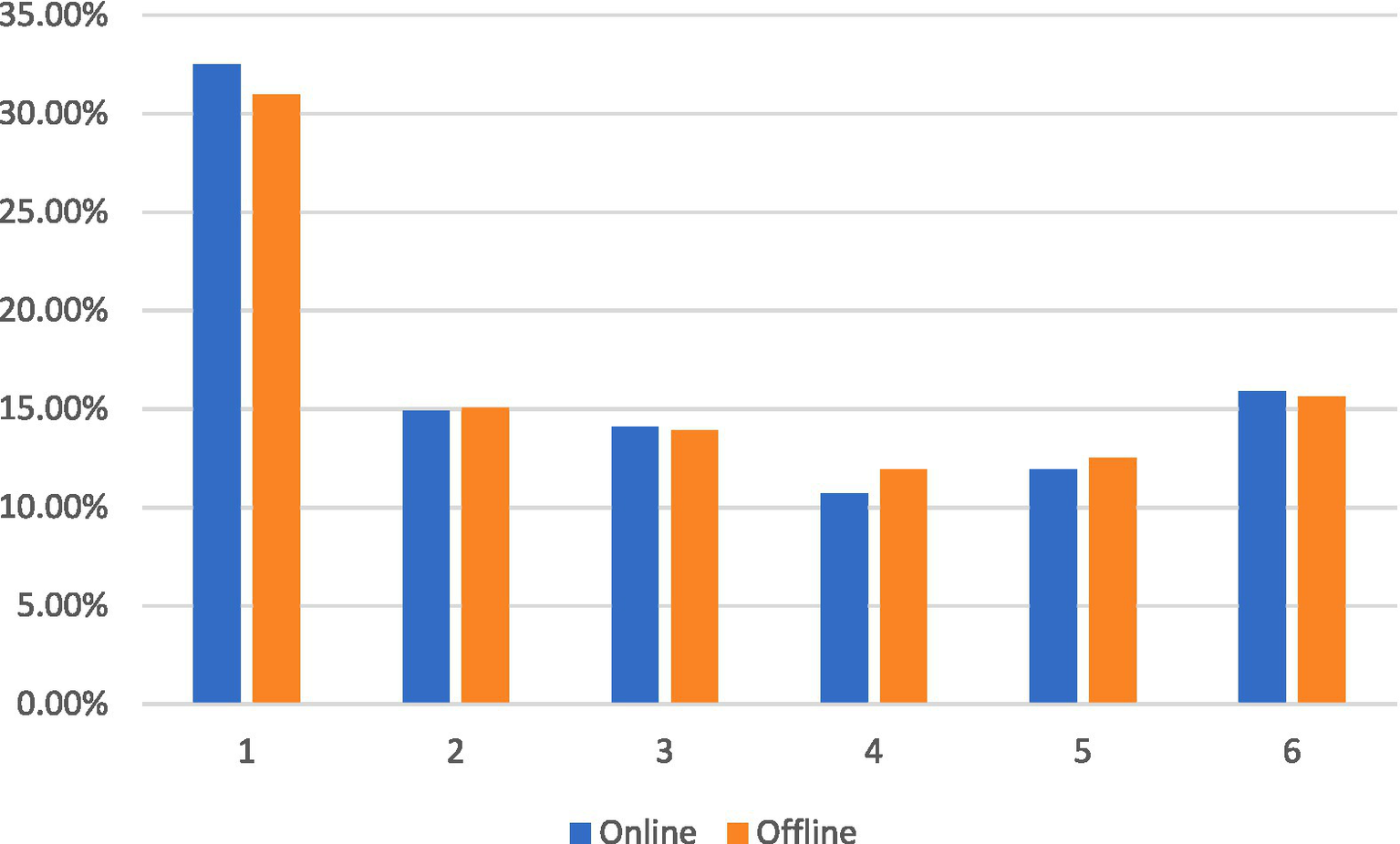 As illustrated in Figure 2, the relative importance of the attributes in both the online and offline survey results exhibited general consistency. The six attributes listed in descending order of importance were institution, mass recognition, salary, title, hours of work, and employment.