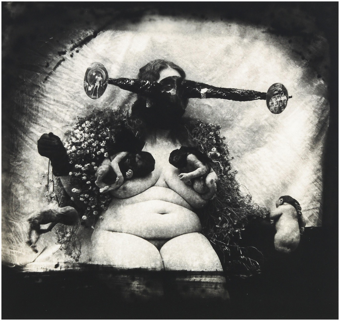 Woman as the Measure of All Things is a disquieting artwork, and each viewing reveals a new element. The title suggests a reference to the phrase by the philosopher Protagoras (490 BCE–420 BCE), “man is the measure of all things,” but with “man” replaced by “woman.” In this possible interpretation of Protagoras, Witkin presents a woman, a kind of goddess, holding a fetus in one hand. On the other side, there is a baby with congenital malformations. The central figure is covered in ornaments: a cloak of flowers interspersed with veiled babies, suspended over her breasts. The woman’s gaze, from behind a bizarre mask composed of cutouts from other images, is haunting. A more detailed analysis reveals a skeletal, unbalanced figure on the left side of the mask and a thin women in coffins on the right side, reinforcing the dark, macabre, and gloomy nature of the work.