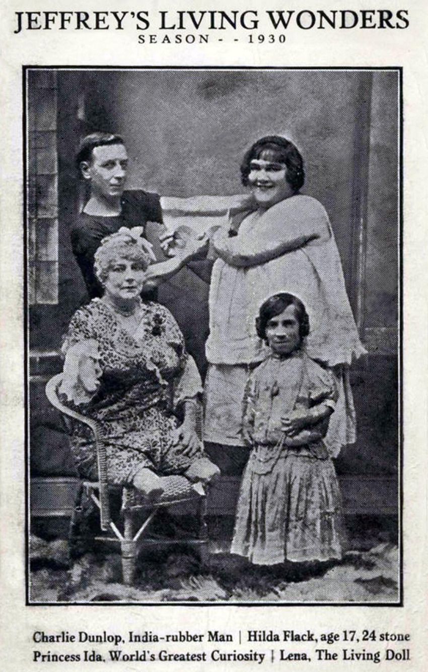 Figure 4. Promotional business card from Jeffrey’s Living Wonders, from the 1930 season. Back: Charlie Dunlop (Indian Rubber Man), Hilda Flack (fat lady). Front: Princess Ida and Lena (Living Doll). Available at: sideshowworld.com. Last accessed on: May 18, 2024.