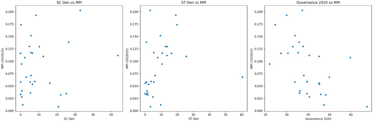 The current study attempts to observe the role of local governance effectiveness and SC/ST population density in the prevalence of multidimensional poverty in rural areas across Indian states. Given that our data is cross-sectional, we use correlation and regression models for data analysis (Setia, 2016). To measure the “strength and direction” of three pairs containing two variables each (i.e., the association of SC population density and multidimensional poverty, ST population density and multidimensional poverty, and local governance effectiveness and multidimensional poverty), we use Pearson’s correlation coefficient (Ahlgren et al., 2003). We also use a regression framework to examine the extent to which multidimensional poverty is explained by our choice variables—local governance effectiveness and SC/ST population density (Balasubramanian et al., 2023). With representing local governance effectiveness, representing scheduled caste population density, representing scheduled tribe population density, and denoting the error/residual term, the regression equation for this study is: