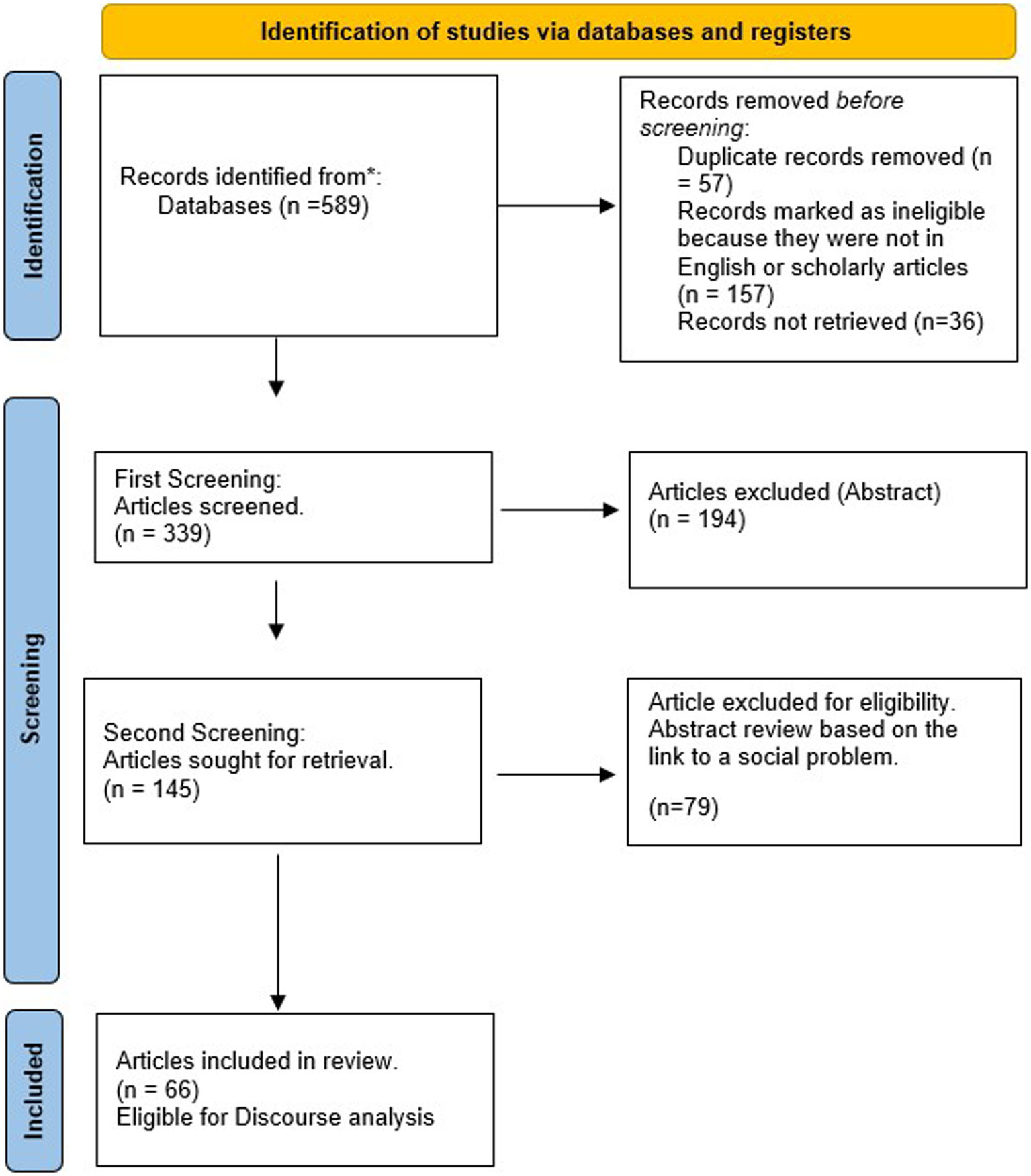 Figure 2 illustrates that the literature search resulted in a total of 589 articles being retrieved from the three different databases. In the identification phase, 250 papers were removed as duplicates, non-English and irretrievable. All 339 articles were uploaded into Atlas.ti where three codes were used; (i) country, (ii) profession, and (iii) journal. The country code was used to identify in which country or countries the research was based. The profession code captured which profession/s was covered and finally the journal in which the paper was published. The first stage of the screening process involved the review of abstracts, which led to another 194 papers being excluded based on the review criteria. This screening involved two rounds of review between reviewers. Firstly, there was an assessment as to whether the abstract reasonably suggests that the paper seeks to engage with the construct of profession for analytical purposes. 194 articles were excluded based on an abstract that did not provide insights as to how the article engaged with the construct or how it employed the construct to explain a social problem. This resulted in a total of 145 eligible papers. Secondly, abstracts underwent another round of review, where reviewers excluded papers not explicitly recognizing the link between professions and a social problem (such as inequality, sexism or racism). The remaining 66 papers were selected for full-text retrieval and considered eligible for full review and discourse analysis.