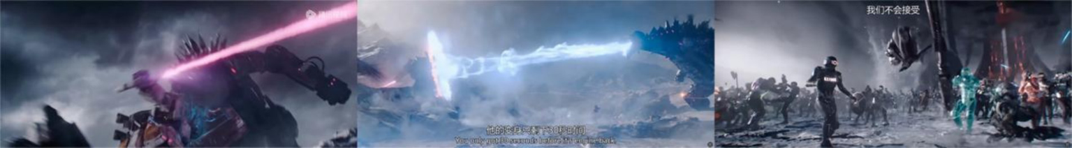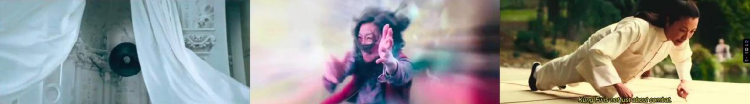 Among the character-related special effects, some possess special skills, and the design of special effects for these skills is also full of gameplay. For example, in character-related special effects, some characters possess unique skills, and the design of these skills’ effects is filled with a gaming vibe. For instance, after the protagonist Evelyn gains the ability to jump between universes, she could access various abilities from different versions of herself across these universes, such as martial arts, cooking, singing, etc., helping her overcome the challenges she faces. This allows the audience to more intuitively experience the character’s powerful abilities. In Figure 3’s Frame 2, Evelyn uses a tool that assists her in universe jumping, traveling through time and space. Countless light and shadow transformations appear on the screen, clearly showing the shifting scenes of time and space, enhancing the audience’s sense of immersion. Additionally, in Frame 3, when the protagonist faces danger, she jumps to the Kung Fu universe, gains martial arts abilities, and quickly defeats the villain with high combat strength. The combination of action and special effects makes the audience feel as if they are involved in the action across the multiverse, creating a game-like sense of immersion.