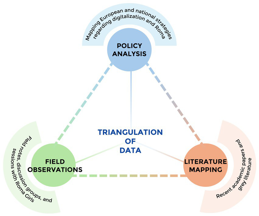 In order to map the digital experiences of Roma girls, a triangulation approach was employed integrating: (1) policy analysis to review the relevant European and national policies on Roma inclusion and digitalization to establish the broader policy context. (2) field observations were conducted in educational settings within the Torreblanca and Polígono Sur neighborhoods, where researchers gathered detailed notes on lived experiences of Roma girls such as the daily interactions and practices related to digitalization. These observational insights were organized and interpreted through the lens of the ecological model, which allowed us to contextualize individual, interpersonal, community, and structural factors; (3) Complementing these data, a targeted literature review provided theoretical grounding and comparative perspectives with the observational insights. This triangulation of multiple sources enabled a nuanced understanding of the interplay between policy frameworks, lived experiences, and scholarly knowledge, enhancing the depth and validity of this analysis.