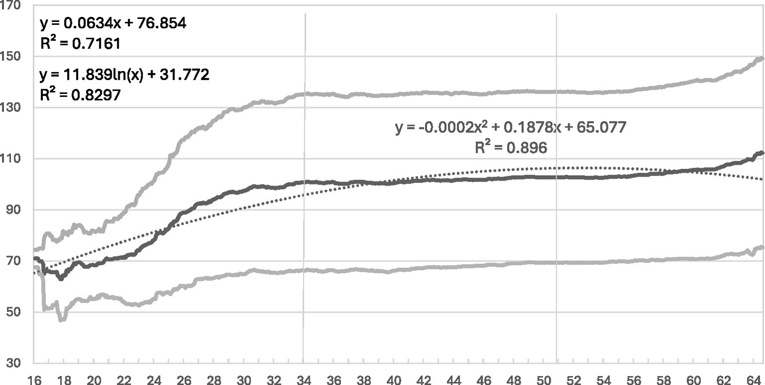 A linear, quadratic, and logarithmic regression of the MPS means for each month were computed. Of these, the quadratic and logarithmic equations should perform better than the linear one because they capture the early increase and the later constancy. According to the R2 values, the quadratic equation performs best. MPS increases from 65 at age 16 by 0.19 units per month and decreases by 0.0002 per month squared. Its fitted values, represented by the narrowly dotted curve in Figure 2, show a linear increase that bends slightly at both early and late ages. Were it not for the slight increase in the empirical values after age 60, the predicted development of MPS could be interpreted as a case of “diminishing marginal utility” (Samuelson and Nordhaus, 1998, pp. 81–2) over time.