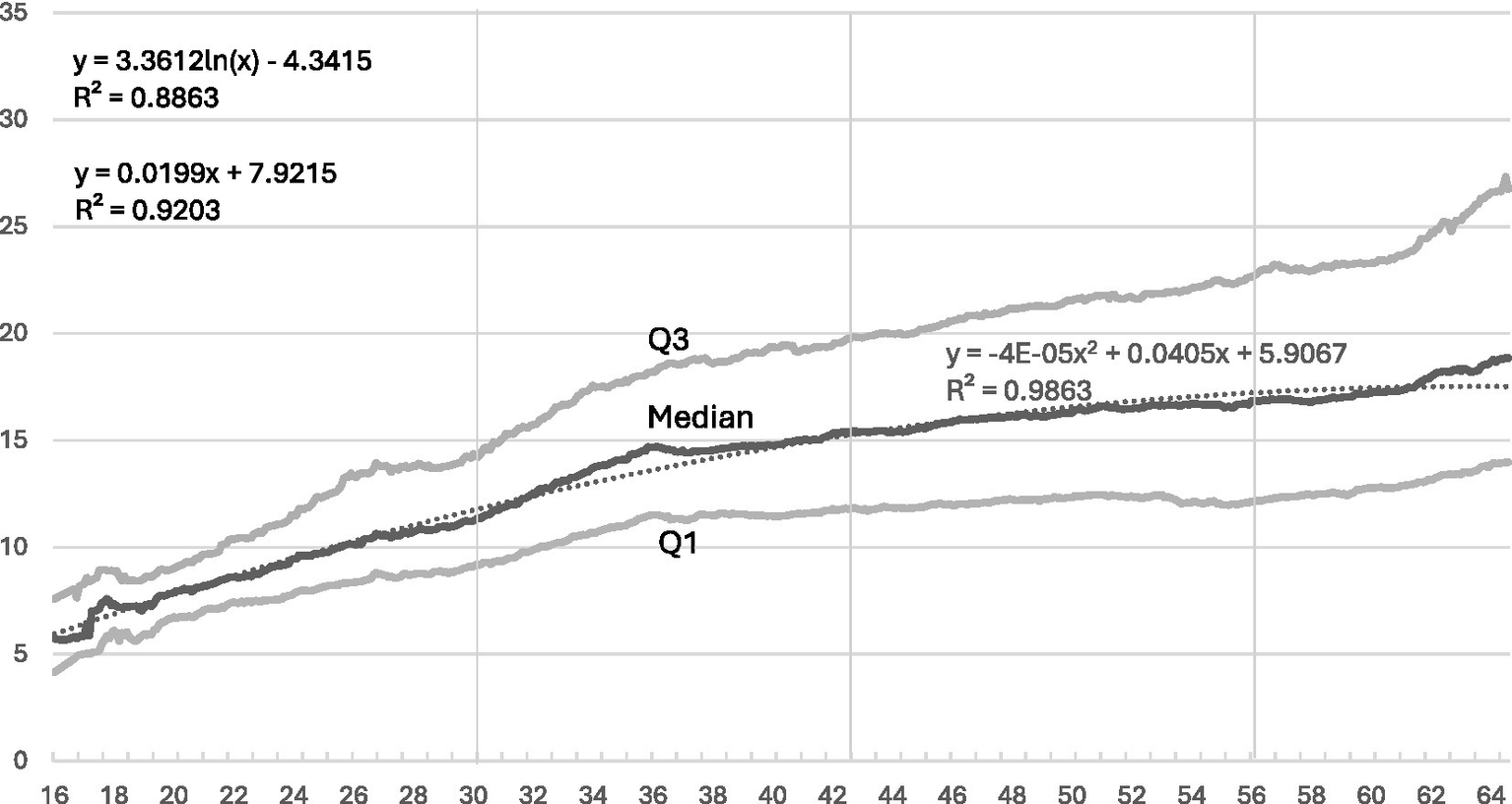 Again, a linear, quadratic, and logarithmic regression were computed. Again, the quadratic and logarithmic equations, which capture the decreasing rate of increase, should perform better than the linear one. Indeed, the quadratic equation performs best and is again presented as a dotted curve. The median of HINC increases from 6 € at age 16 by 0.04 € per month and decreases by 0.00002 € per month squared. The fitted curve is predominantly linear with only slight downward bends at the ends. It closely reproduces the empirical values throughout the entire life course.