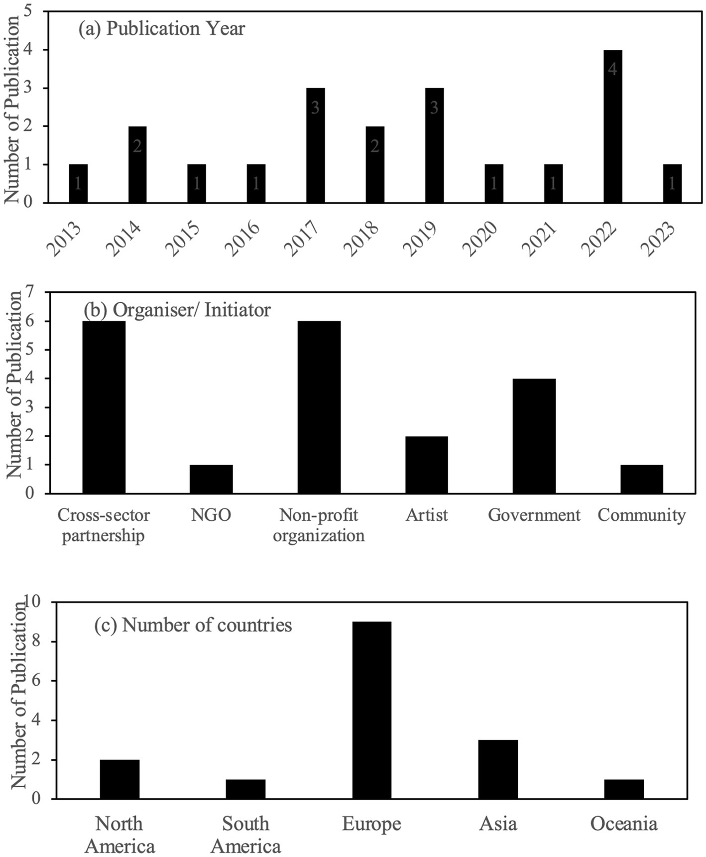 Publications on participatory art: (a) Number of publications by year; (b) Types of organisers/initiators leading participatory art projects; (c) Number of publications from countries grouped by region.