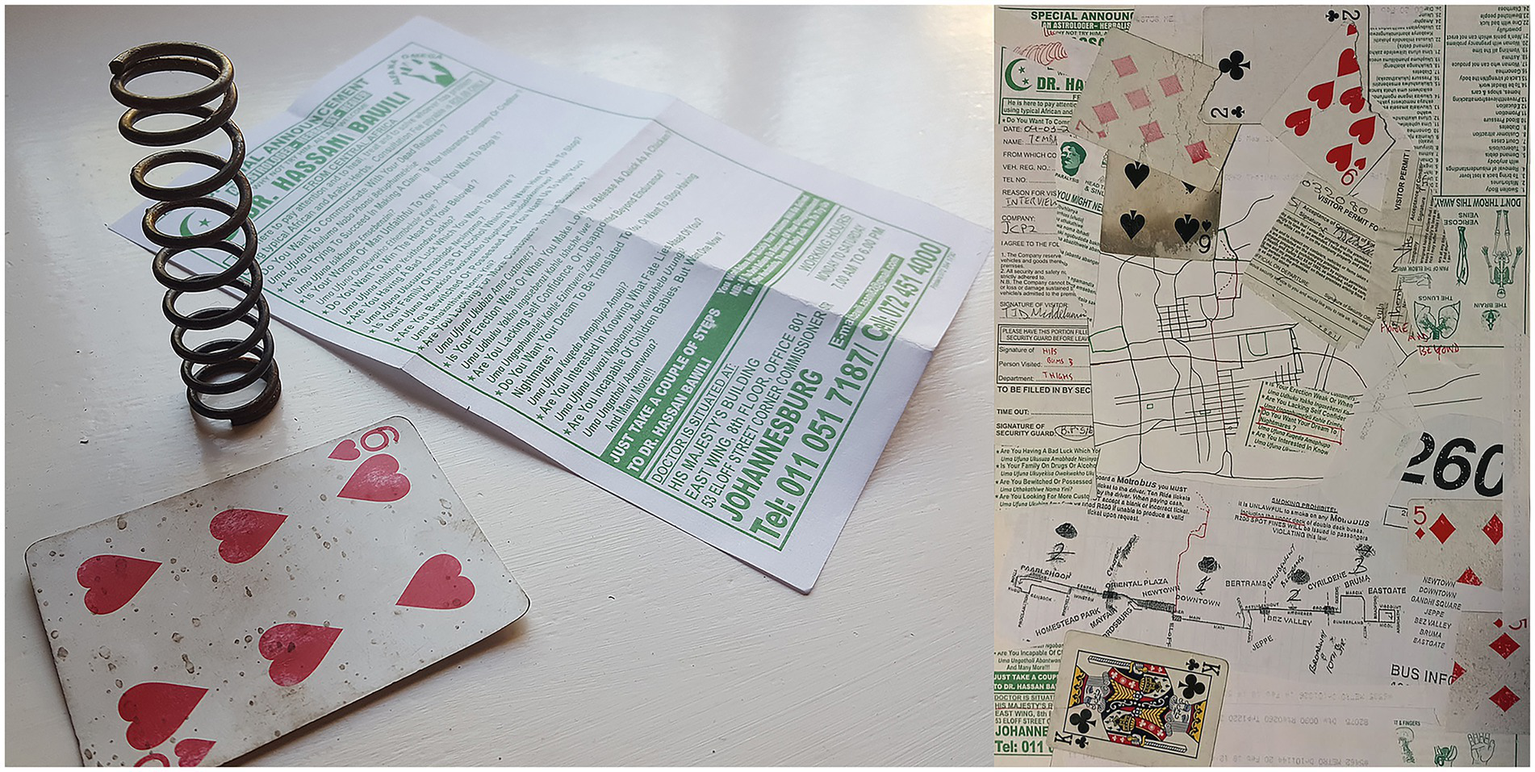 On the left is a collection from a day’s research in 2018 of playing card (the significance of playing cards, both discarded and collected, is reflected on in Middelmann (2024), which also discusses the links between collecting, research, and artistic production.), spring and ubiquitous Johannesburg-style pamphlet. On the right is a collage juxtaposing collected objects from research-fieldwork with author’s hand-drawn map of the research area.
