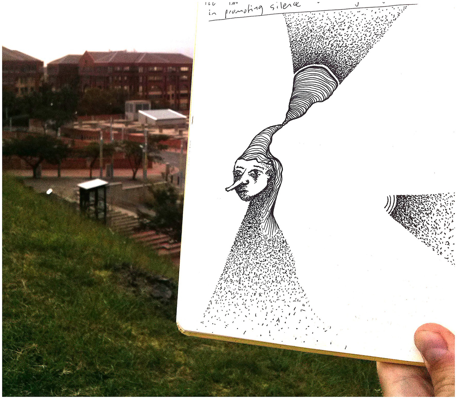 Drawing by author from 2016 during one of the first phases of public space fieldwork. The drawing evokes the early stages of becoming a member of the public, showing a disembodied self sending out signals to their surroundings. By being and knowing myself better in public space, I was working towards connecting with others. Sitting and drawing in public space as part of my research practice also evokes crip time—this was not active research in the sense of careful observation and intentional conversations/interviews—it was a case of an introverted, neurodivergent artist-researcher being and becoming themselves as an entry-point into the research process. A key connecting idea here is about cultivating authentic presence in public space, which I argue below is key to genuine connections and collaborative research and advocacy.