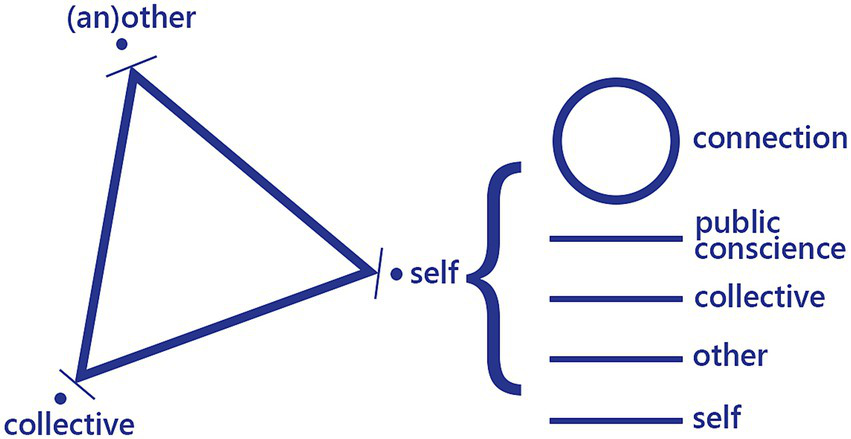 The right-hand part of the diagram disambiguates elements of the self, from the first pole of the self, the second pole representing another, the third pole of collectives, and the fourth of public conscience. The circle above shows that these different levels are connected for everyone, reminding us that the different levels, ourselves and others, are all part of the same whole. Importantly, the triangle is whole, demonstrating the reality of entanglement and mutual constitution between selves, others and collectives. Furthermore, implicit is the constellation of these relationships creating webs of interaction starting from all selves and constituting collectives through interpersonal contact. As written by de Certeau (1980/1984: xi), ‘each individual is a locus in which an incoherent (and often contradictory) plurality of such relational determinations interact’, noting how these ‘systems of operational combination … also compose a “culture.”’ As people move towards and with one another, this culture becomes more public, more inclusive, and more supporting of communities of wellbeing.
