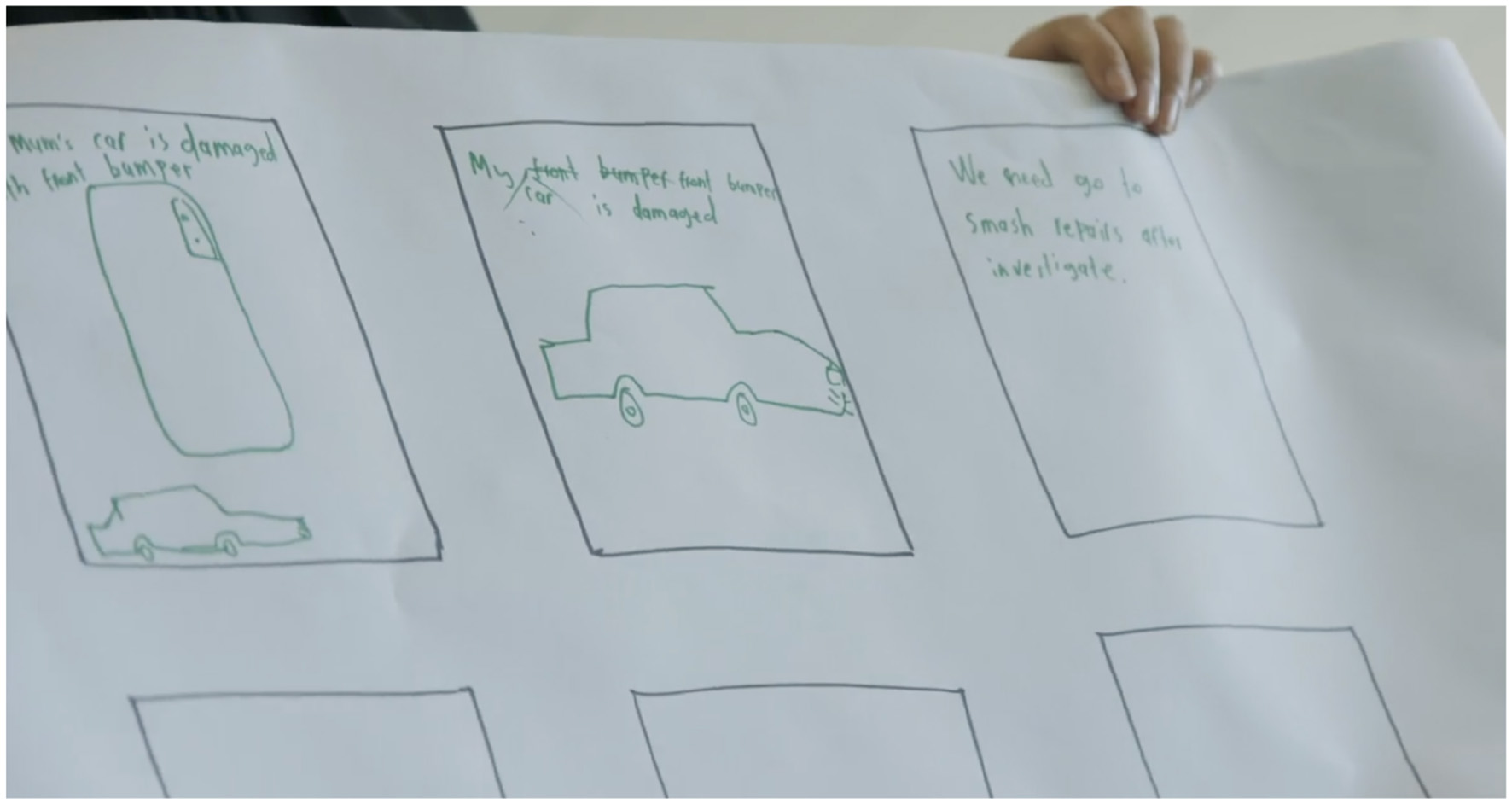 A participant displays their drawings, created during the workshop, to describe their experience with video gaming and its association with their future driving competency.
