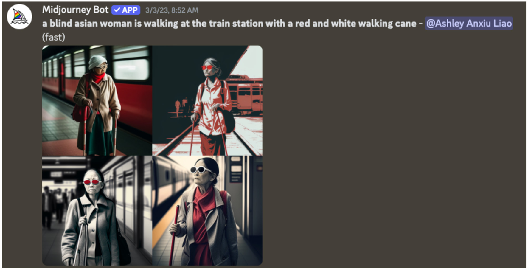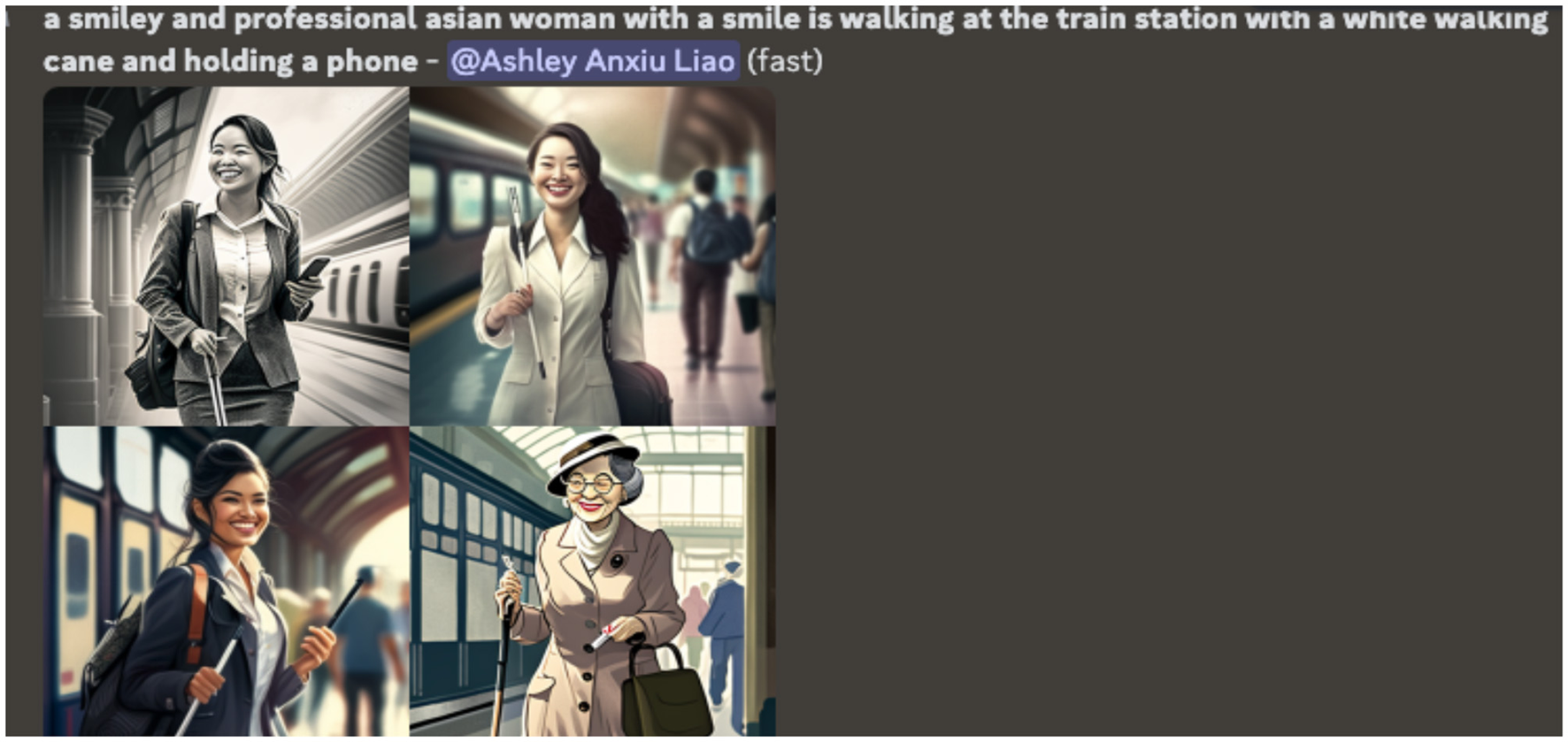 A screenshot of one of the preliminary visual image outputs from generative AI. The images display an elderly East Asian woman walking with a cane and dark glasses.