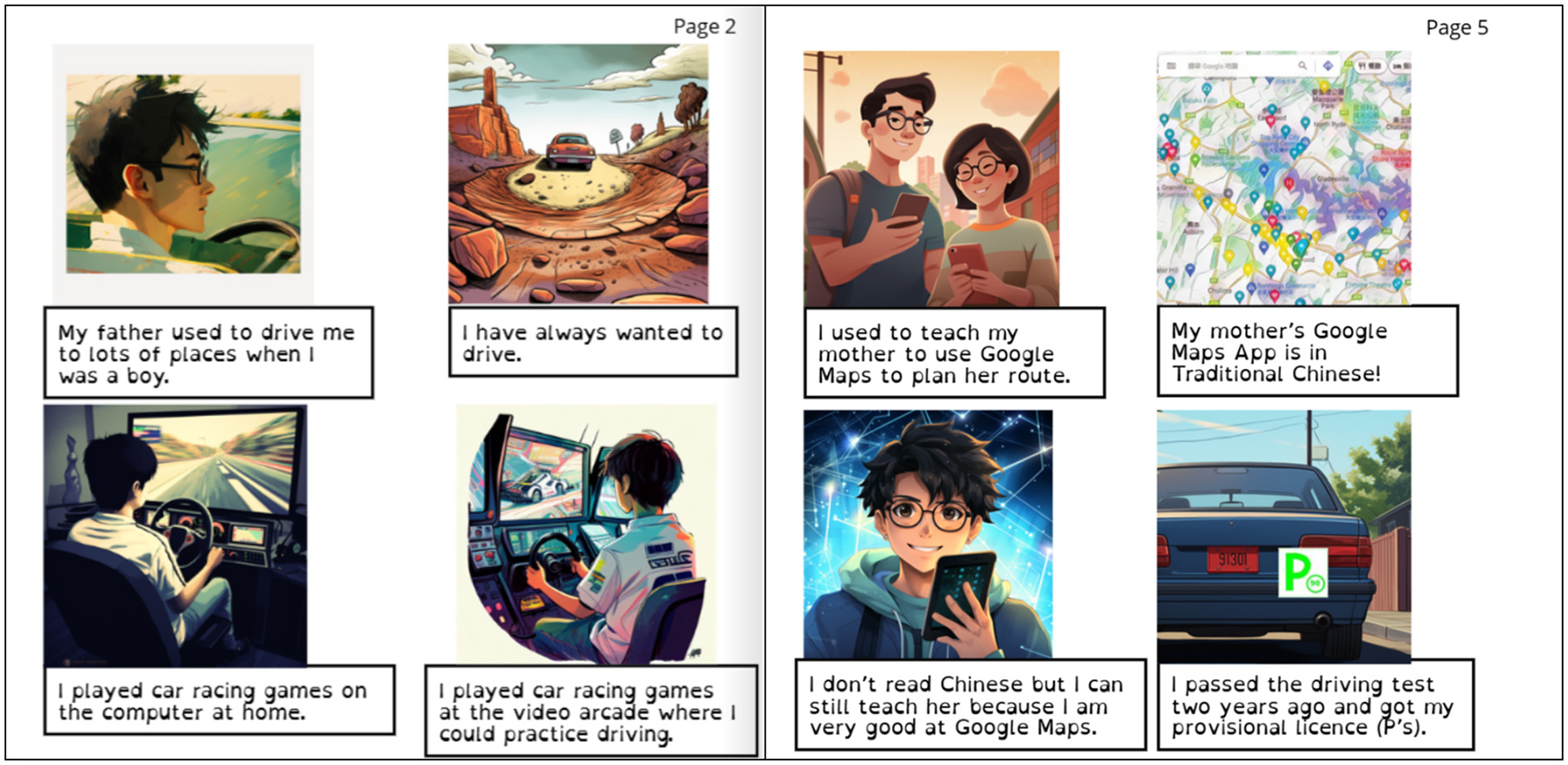 After the completion of the data collection process across both rounds of workshops (online and in-person) and post-workshop interviews, the research team collaborated with five participants, whose details are provided below in each of the case studies, to co-create multilingual, disability-accessible AI-generated e-books. The co-creation activities were conducted using MidJourney a generative AI program and took place between November 2022 and October 2023 during which MidJourney Versions 4 and 5 were used. As AI tools evolve rapidly, the e-books described in this paper reflect a specific snapshot of generative AI capabilities during that period. Using this platform, these e-books visually and textually represented participants' experiences with everyday consumer technologies. Beyond documenting personal experiences, the co-creation journey provided insights into participants' technological engagement and accessibility needs. First, we learnt about (1) the barriers in navigating digital accessibility and the burden of self-advocacy, (2) the biases embedded in AI-generated imagery, especially in relation to gender, race, disability, age, and body weight, and (3), the role of everyday consumer technologies in fostering agency through self-directed learning, cultural engagement, mobility, and caregiving support.