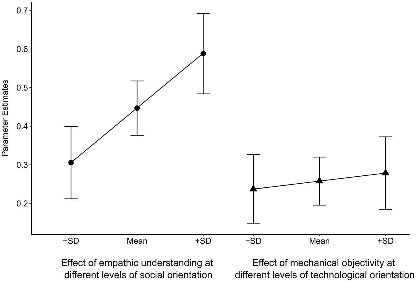Technological orientation refers to the need to interact with technological artifacts and the value of making new experiences with emerging technologies (Horstmann and Krämer, 2019). Technologically oriented individuals should feel more comfortable with using new technologies to solve social problems (O’Shaughnessy et al., 2023). Research has mostly shown that technological affinity or efficacy, innovation appreciation, prior experience with, and knowledge of AI all contribute to positive attitudes towards AI (Horstmann and Krämer, 2019; Korn et al., 2021; Mantello et al., 2023; Mays et al., 2022; Shulner-Tal et al., 2023; as an exception Yigitcanlar et al., 2022). Some studies hint at an interaction effect between technological orientation and mechanical objectivity. As Graham (2022) has shown in a discourse analysis, academics in technological disciplines emphasize rule-following for the programming of ethical AI more strongly than scholars from humanities, the latter being skeptical of the codifiability of morality. Additionally, in a study by Shin (2022), algorithmic literacy increased the effect of trust on the credibility of algorithmic outputs. Given the elective affinity of mechanical objectivity with technological artifacts (Beer, 2016; Daston and Galison, 1992; Xu et al., 2022), the permissibility of mechanically objective AI should hence increase with technological orientation: