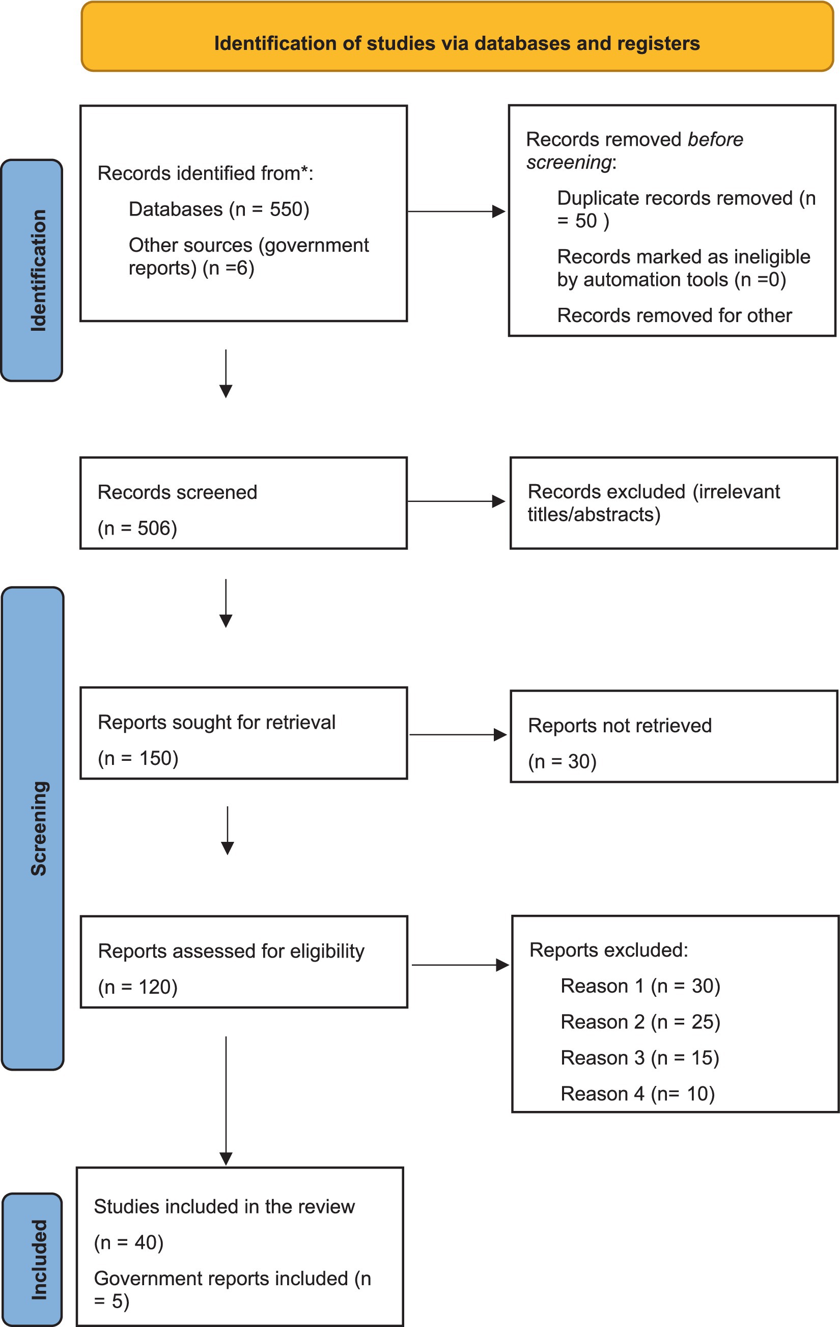 From the selected databases and other sources, 550 records were identified, in addition to 6 from government reports, totaling 556. Records retrieved at each stage of this process were summarized in Figure 1. Fifty duplicate records were removed, leaving 506 unique records to be screened. After eliminating irrelevant articles by reviewing titles and abstracts, 356 records were excluded, which narrowed the focus to women’s digital empowerment within the South African public sector. The remaining relevant articles numbered 150, plus 6 government reports, making a total of 156 records for further full-text analysis.
