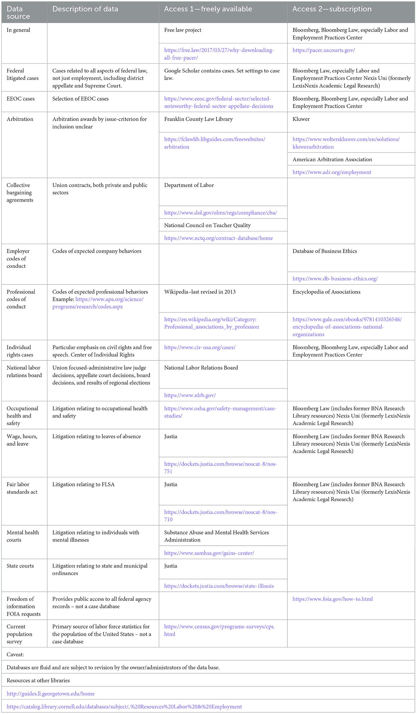 Researchers can use numerous existing databases to research discrimination against individuals who have reported workplace discrimination. As previously indicated, those who take action and file formal complaints of discrimination are rare (Leonard, 1984), and rulings in litigated cases can confirm whether an individual has experienced discrimination beyond claiming it. Researchers with varying levels of data analytics skills can use the databases proposed here, enabling them to research employment discrimination incidents more appropriately. Many of these data sources are readily available for little or no cost. While we describe these databases in more detail below, Table 1 provides some preliminary information about these potential data sources for employment discrimination research. Table 1 provides information describing the data sources, a description of the data contained within the data source, whether the data source is freely accessible, and whether the data source requires a subscription or other related costs. Table 1 is illustrative.