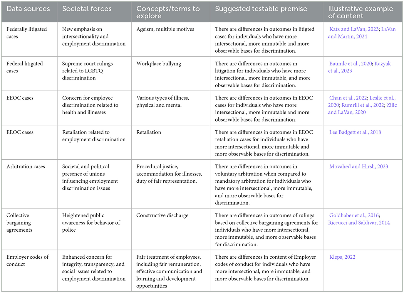 Below, we describe examples of research involving employment discrimination that can be examined utilizing the proposed data sources. Table 2 briefly lists these data sources, associated societal impetuses, potential employment discrimination topics/concepts/terms to explore, suggested testable premises, and illustrative examples of content that may be researched from the databases. These suggestions are meant to be examples and are not intended to be comprehensive.