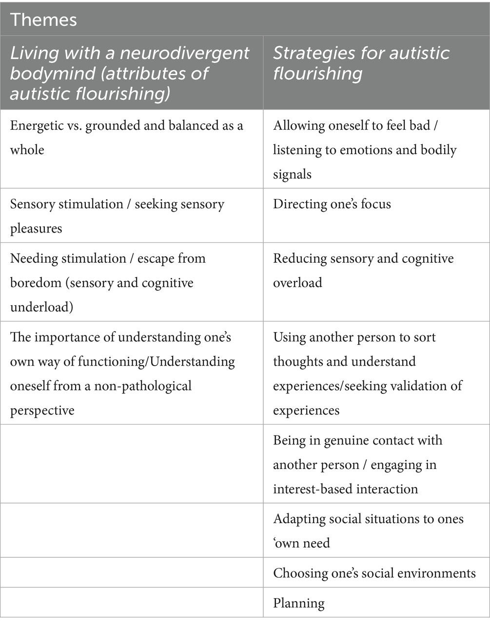 Results: Two themes and twelve subthemes were identified. The first theme, “Living with a neurodivergent bodymind,” presents how autistic women define and experience flourishing. The second theme, “Strategies for autistic flourishing,” highlights actions autistic women take to achieve or maintain flourishing.