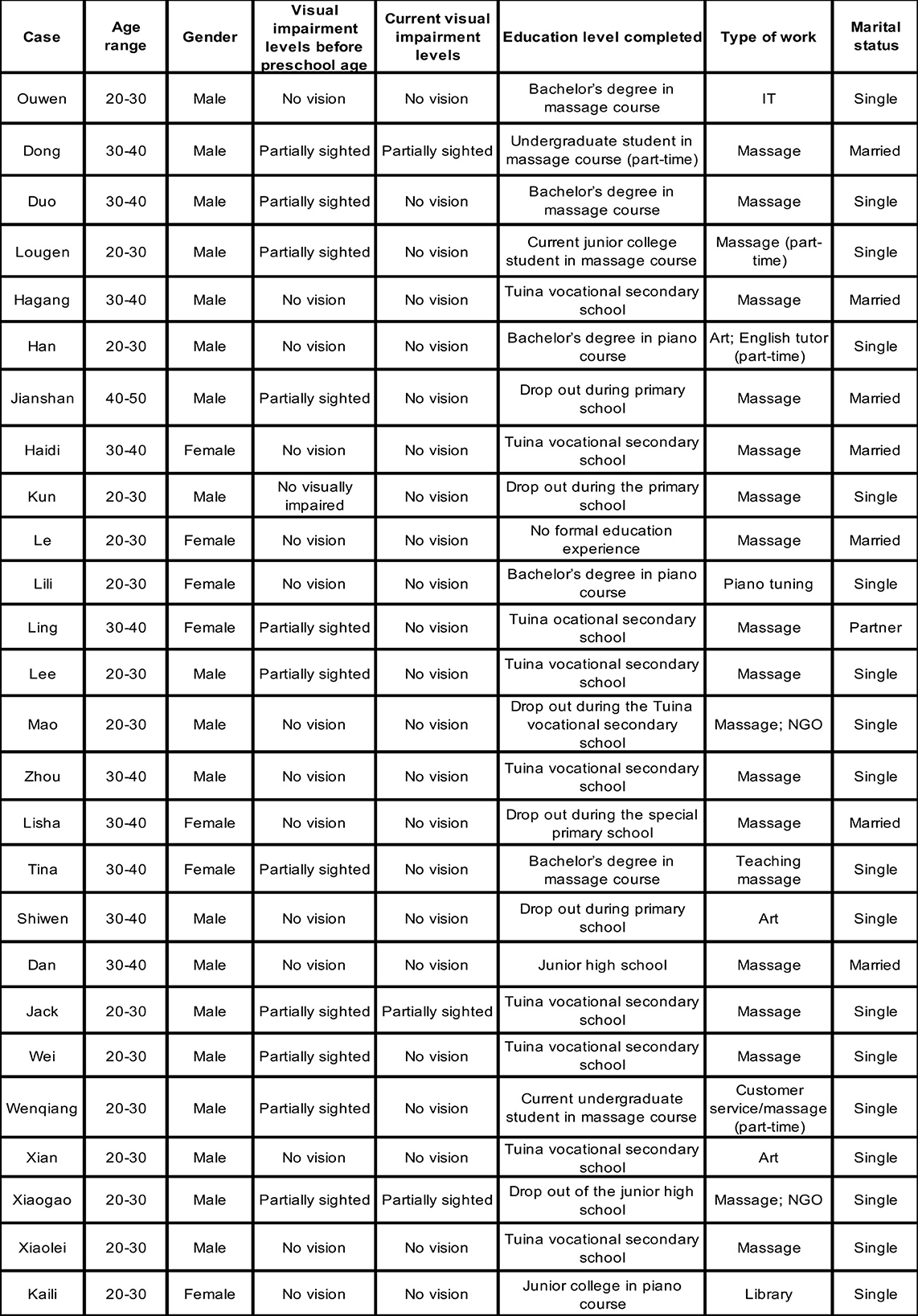 The sample comprised 19 men and 7 women, a male-to-female ratio of approximately 3:1, primarily from Henan Province in Northern China, with 16 from rural and 10 from urban backgrounds. This gender imbalance contrasts with the Second National Sample Survey of Disabilities in China (The Leading Group for the Second National Sample Survey of People with Disabilities, 2006), which reported a near-equal gender distribution among people with disabilities (51.55% men, 48.45% women). The higher proportion of male participants may reflect lower participation rates of women with visual impairments in education and employment, as noted by Liao and Chen (2018). For instance, Xiaogao shared, “In my primary special school class, there were 14 students, but only two were girls”. Similarly, several male participants noted a scarcity or absence of women with visual impairments in their massage workplaces.