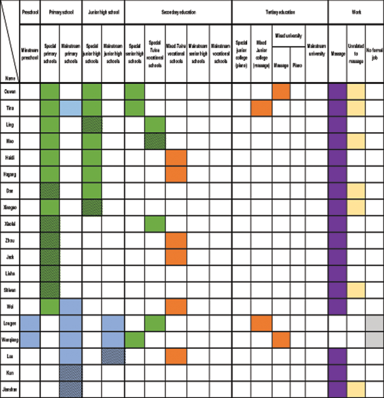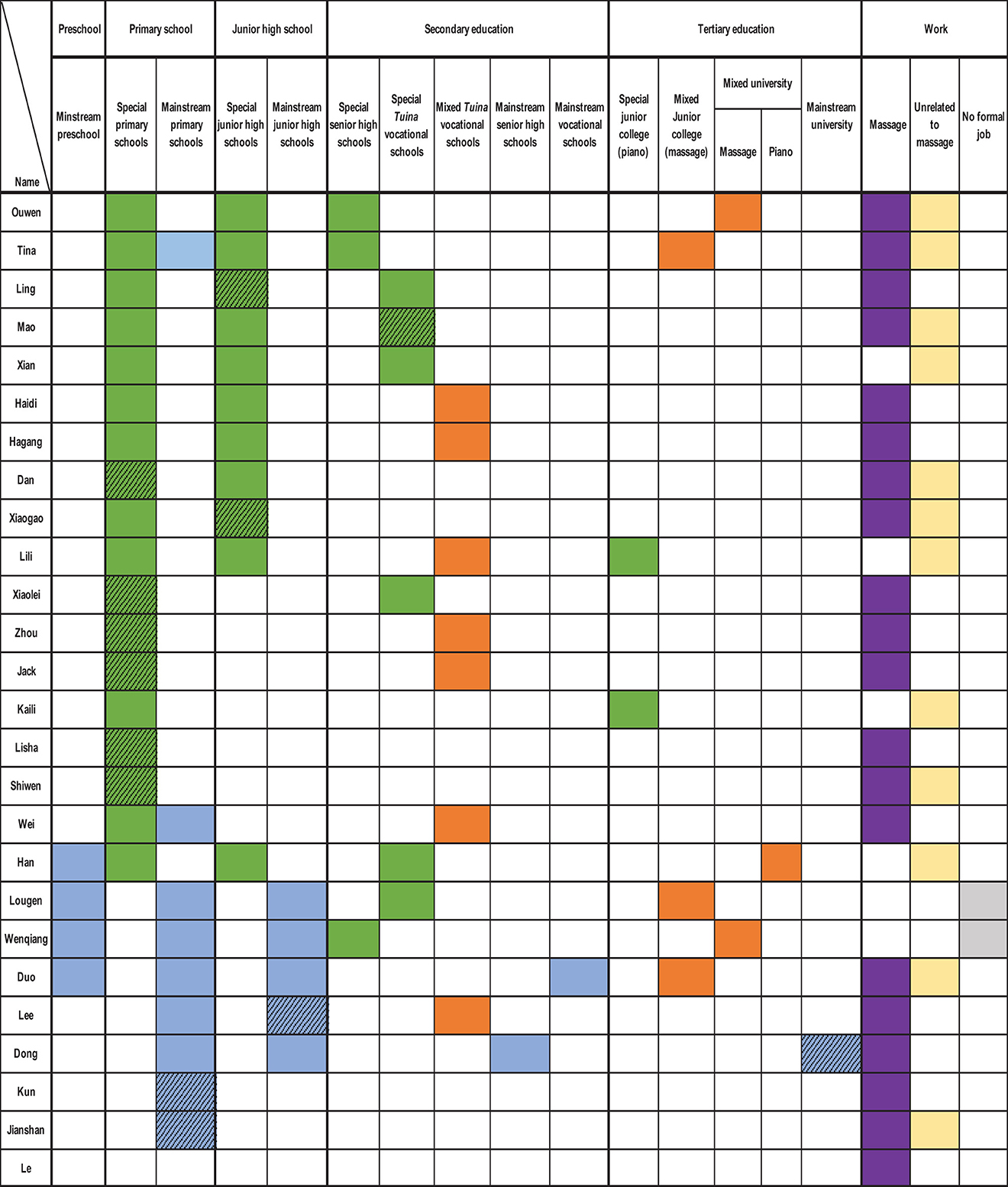 At the tertiary level, some participants attended special or mixed junior colleges (dazhuan 大专) or universities, though course options were limited to tuina or piano training. Employment trajectories included three outcomes: massage industry work (predominant), non-massage careers (e.g., piano tuning, customer service), or no formal employment (two participants in tertiary massage training). Shaded cells in Figure 2 indicate dropouts, highlighting incomplete educational stages.