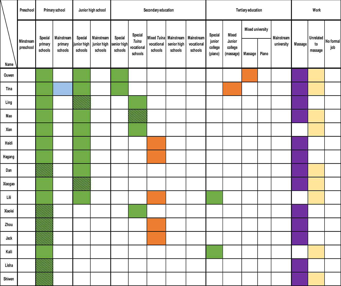 Nineteen participants followed the typical pathway (Figure 6), characterised by non-mainstream education (green/orange cells) and massage industry employment (purple cells). Through Figure 6, these participants had a strong connexion with massage, no matter they started special education or mainstream education. There are two broad channels through which they get massage training—through formal education or informal education. Ten accessed formal tuina training through vocational or tertiary institutions (e.g., Ouwen and Tina), while others pursued informal training (e.g., Xiaolei's short-term program, Mao's apprenticeship). Under these two channels, participants' educational backgrounds appear unimportant, as they all joined the same industry but in different ways.