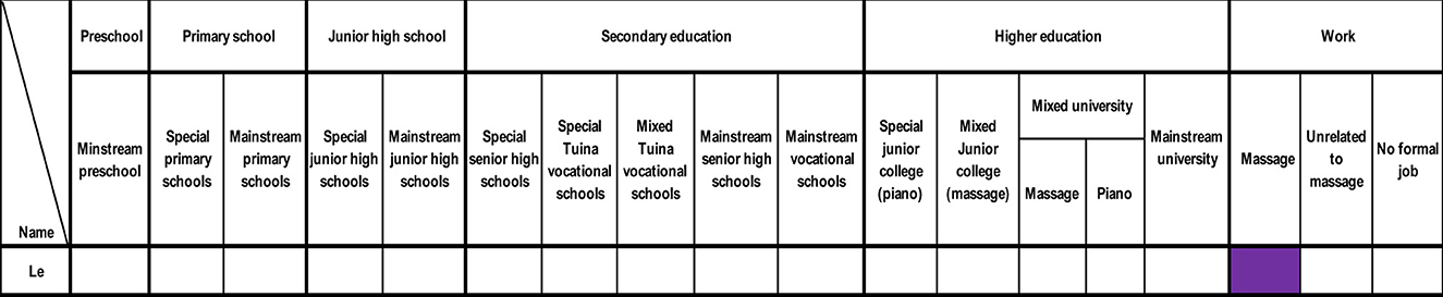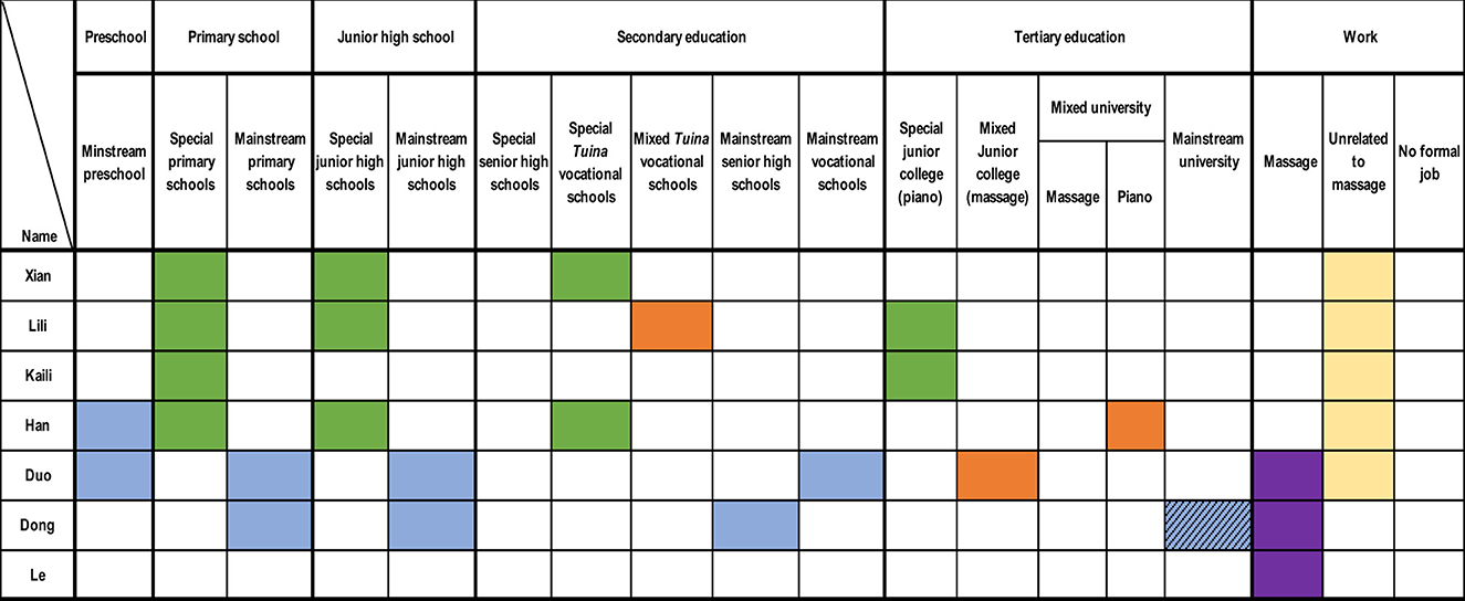 Nine male participants began in mainstream schools (blue cells, Figure 4), eight with partial sight (Wei, Jianshan, Lee, Dong, Lougen, Wenqiang, Duo) or prior vision (Kun), and one with no vision (Han). Four (Han, Lougen, Wenqiang, Duo) attended preschool, aligning with typical ages (3–6). Vision deterioration often marked a turning point (Rutter, 1996), prompting shifts to special/mixed schools or employment changes. Five participants (Wei, Han, Lougen, Wenqiang, Duo) transferred to special/mixed schools due to adaptation challenges or vision loss. For example, Wei transferred to a special primary school in Grade 5 (age 14–15, later than the typical 11–13), later working in massage after tuina vocational training. Han, after preschool, attended special schools and studied piano at a mixed university.