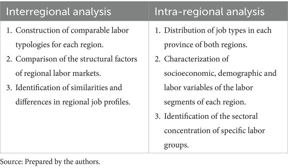 To achieve this, a dual analytical strategy is adopted for a comprehensive understanding of labor dynamics. On the one hand, intraregional analysis serves to characterize the labor structure within each region, taking into account its provinces and internal territorial dynamics. On the other hand, interregional analysis aims to compare the labor structure between both regions, emphasizing the differences and similarities in the composition and distribution of labor groups (Table 1).