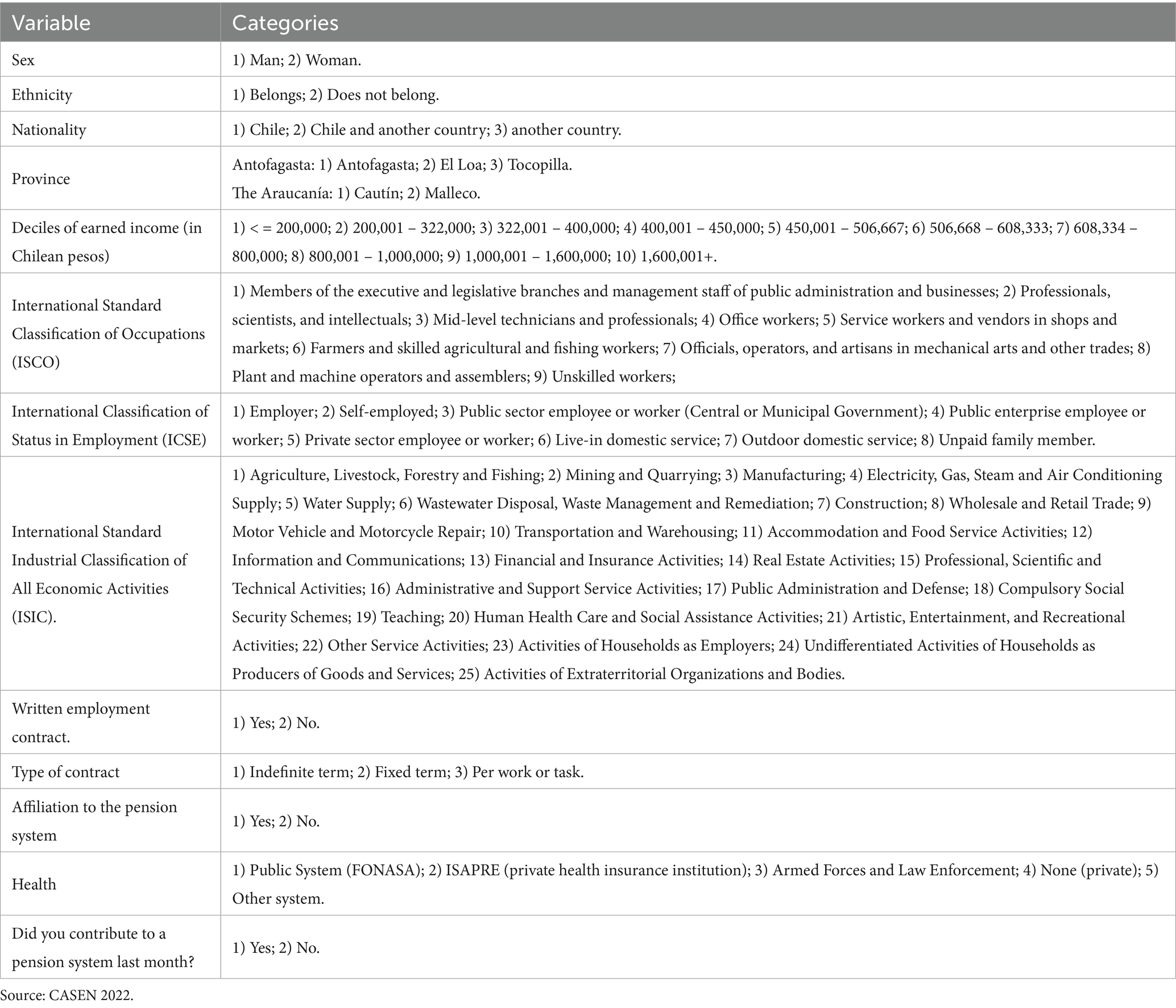 The data source used was the 2022 version of the National Socioeconomic Characterization Survey (CASEN). The following variables were used for the indicators: