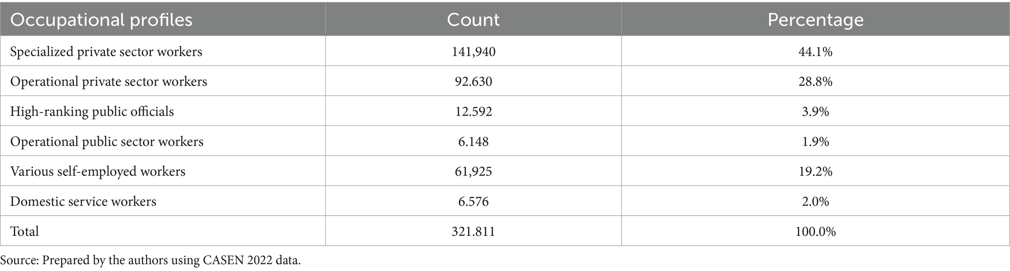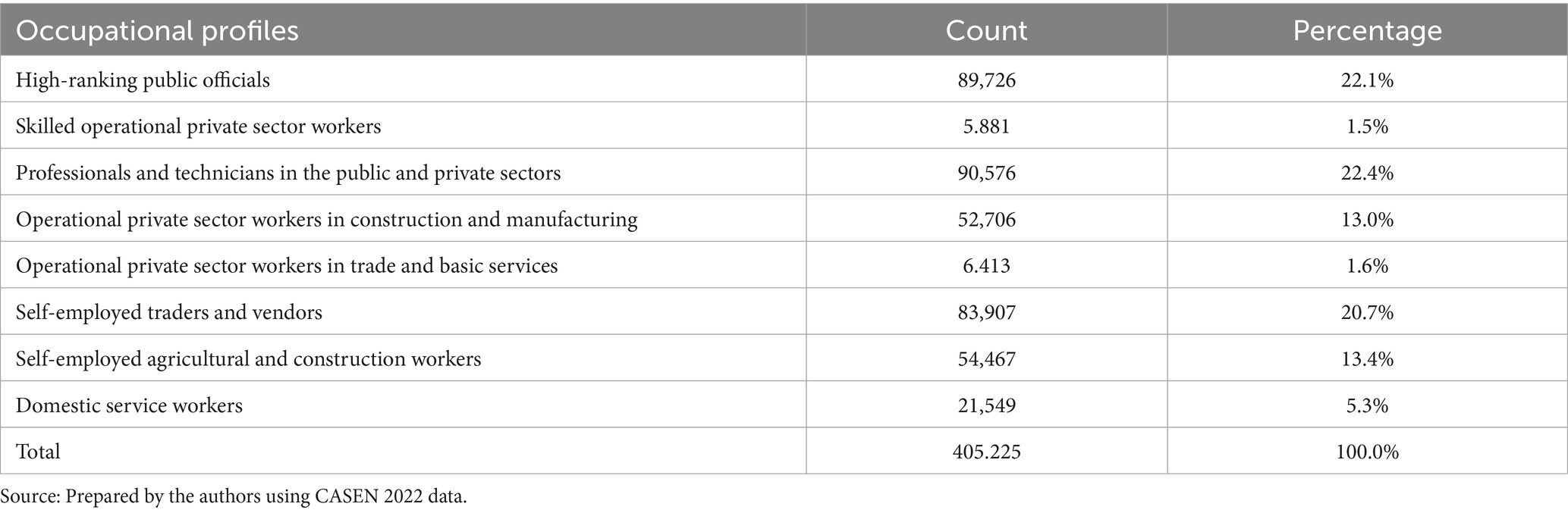 In contrast, Araucanía presents a typology with eight occupational groups that reflect a more heterogeneous labor structure. In this region, public officials, professionals, and technicians from both the public and private sectors represent nearly 45% of the employed population. The operational segments—mainly in commerce, construction, and manufacturing—and the self-employed maintain a strong connection with traditional activities, particularly agriculture. This configuration is associated with greater territorial dispersion of employment and a significant presence of rural labor, suggesting a less urbanized economy with a more diversified productive base.