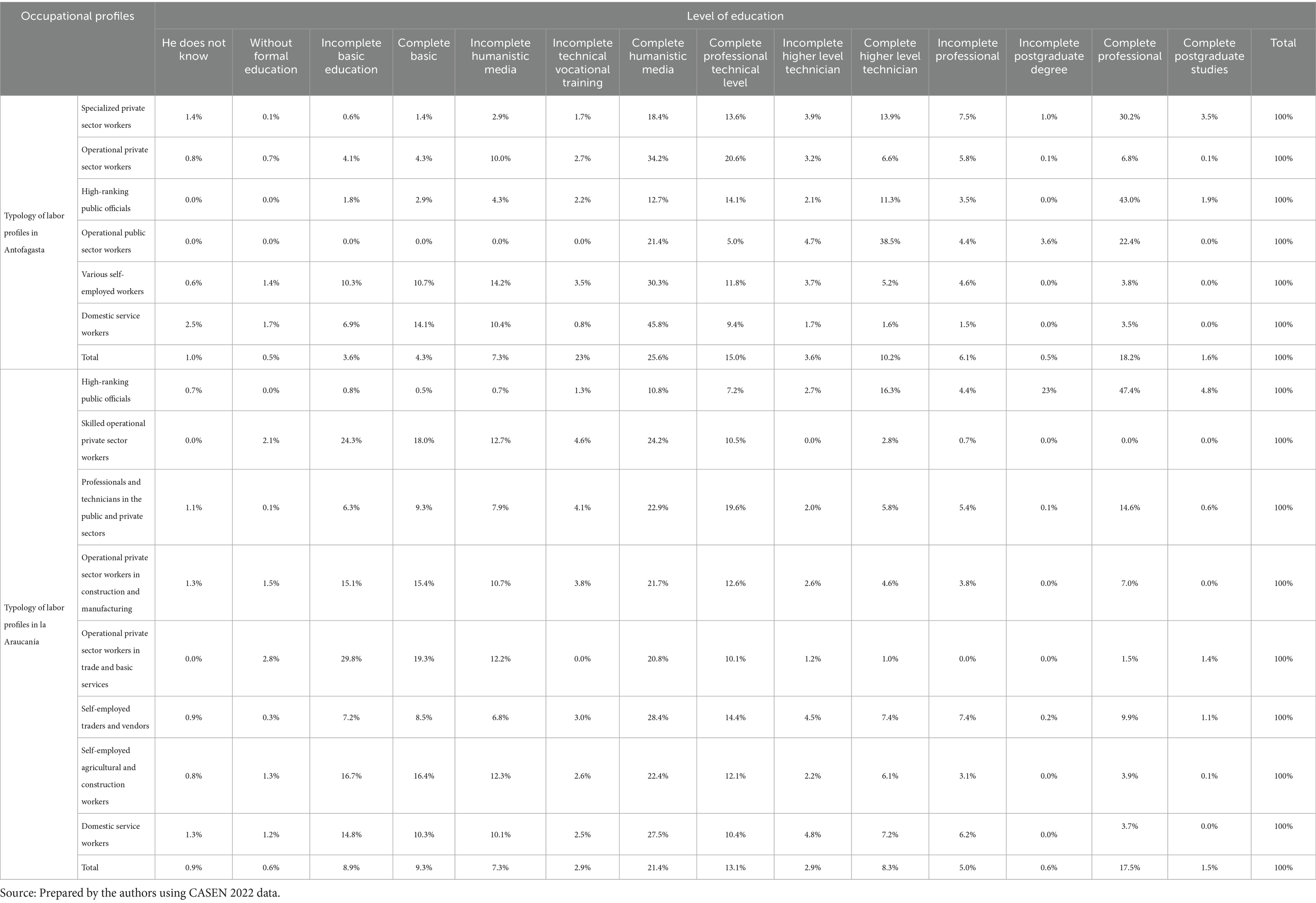 In both regions, the relationship between academic qualifications and access to higher-skilled jobs is evident, although Antofagasta shows a more marked distribution toward secondary and technical training in the operational field. Araucanía shows a greater contrast between occupations with high levels of formal (professional) education and those with low levels of education, particularly in commerce and construction.