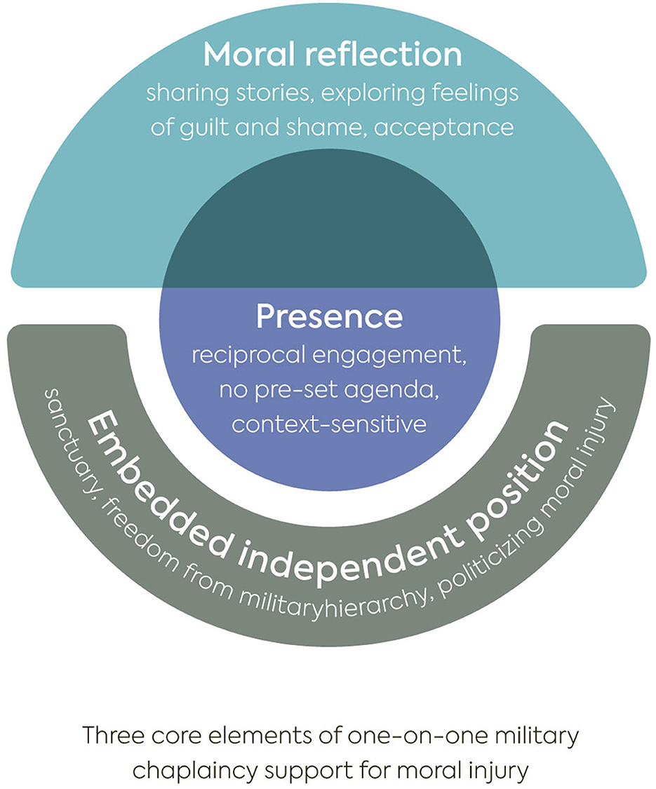 Many of the approaches we identified in Table 1 resonate with the phases of existing military chaplaincy interventions, as outlined in the introduction. These include, for example: establishing rapport, reflecting on and reviewing morally injurious events, addressing feelings of guilt, and working toward reconnection with significant others or spiritual sources. This study adds the following complementary and challenging insights: