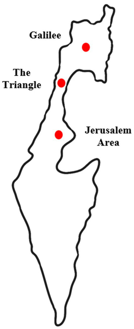 Figure 1. Map of Israel highlighting the three regions included in the study: Galilee, Triangle Area, and Jerusalem Area. Source: Shutterstock, Stock Vector ID 405992995.