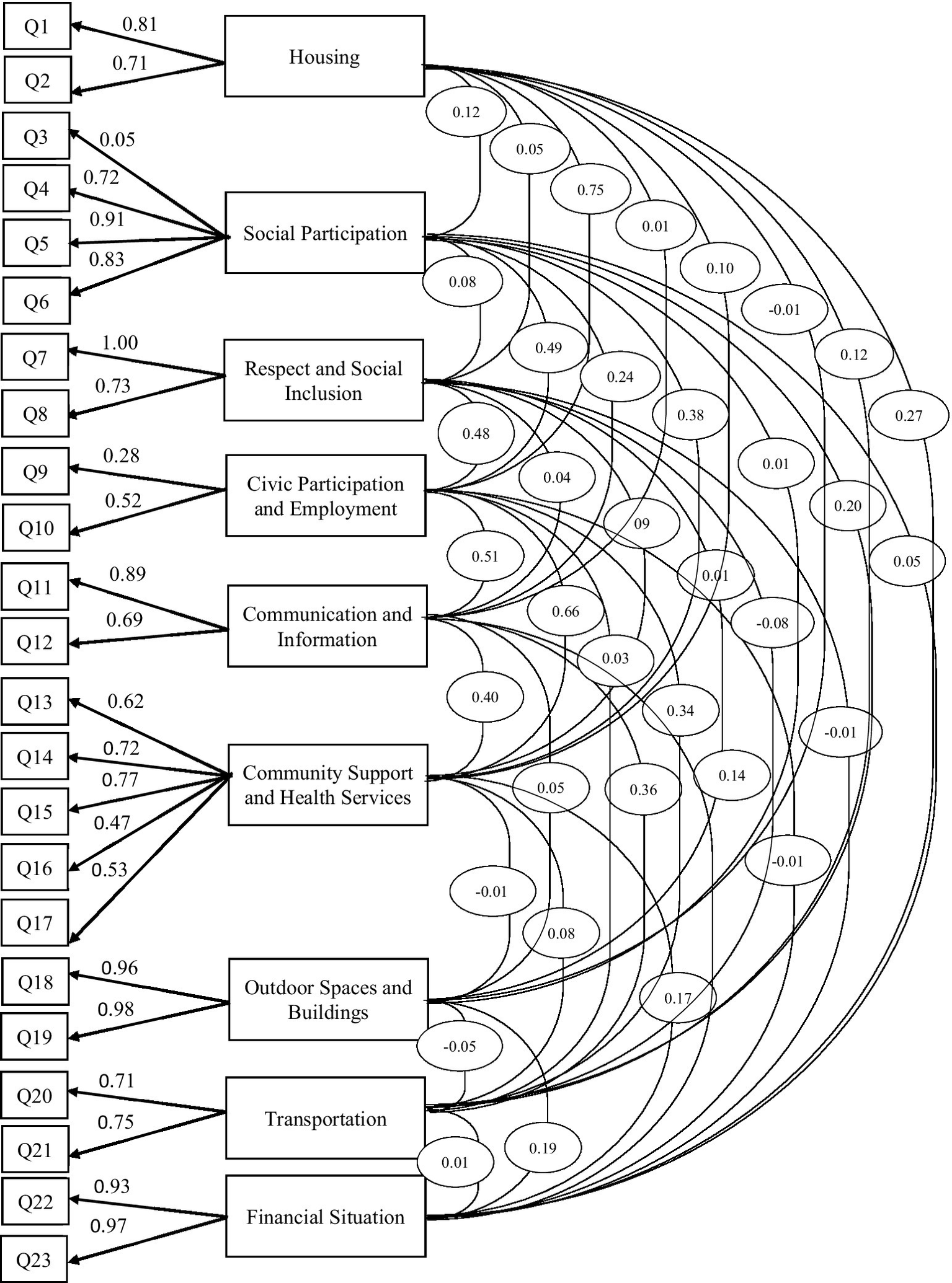 The confirmatory factor analysis revealed that most items on the AFCCQ-Arabic demonstrated standardized factor loadings above 0.40, indicating satisfactory associations with their respective latent constructs (see Figure 2). However, two items exhibited lower loadings: item #3 (“opportunities to meet people in the neighborhood”) from the social participation domain (loading = 0.056), and item #9 (“opportunities to interact with younger generations”) from the civic participation and employment domain (loading = 0.280). Despite these lower values, the overall pattern of loadings aligns well with the factor structure proposed by Dikken et al. (2020).