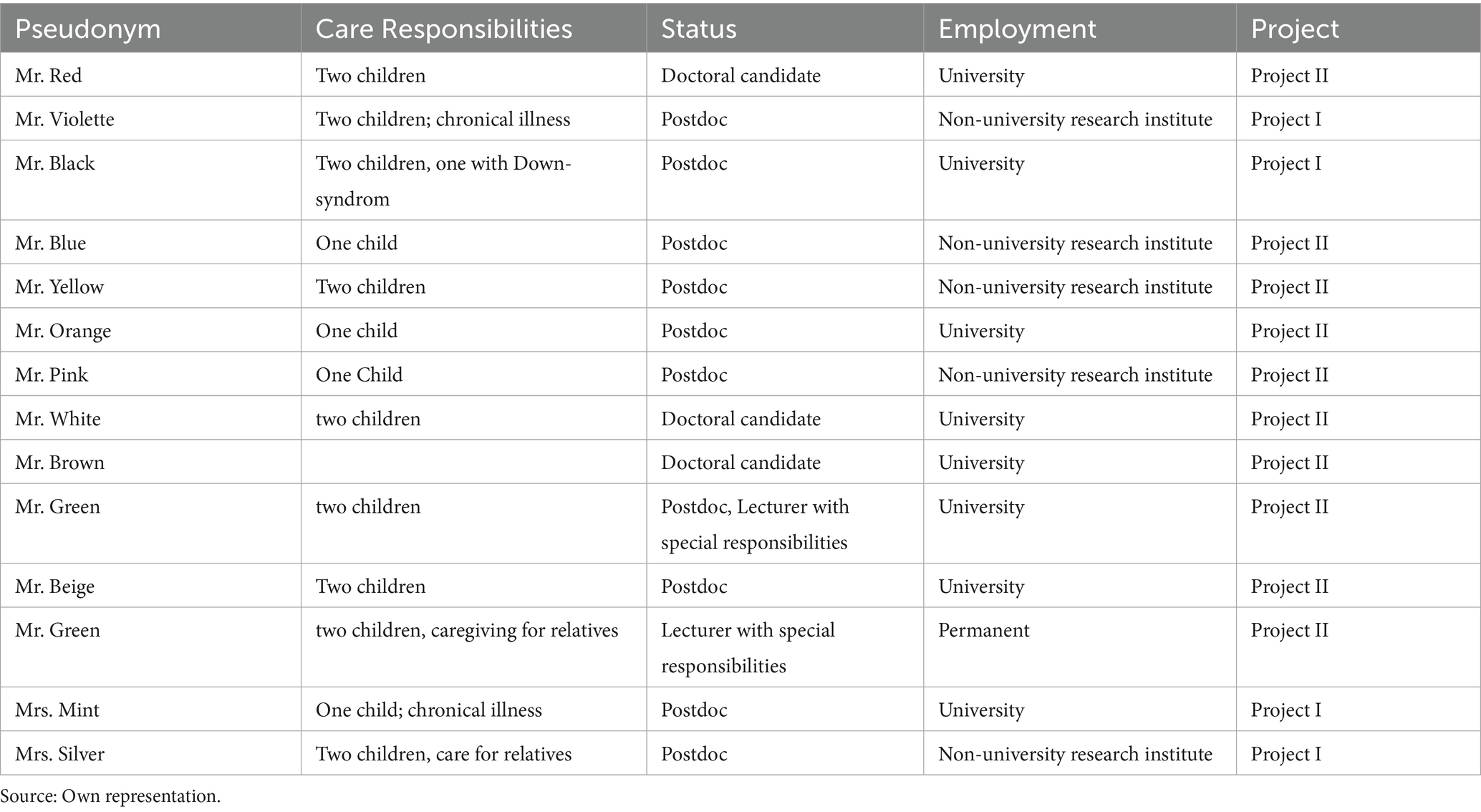For the presentation of results, we selected those participants in both studies aged 32–44 who, as early-career researchers, have care responsibilities (e.g., childcare, elderly care) for others or for themselves (e.g., due to chronic illness). Health is not only understood as the state of health of the researchers themselves, but is also analyzed in the context of caring for sick third parties. In study I selected two Discussions: one with three mothers (all postdocs at German universities, including two on fixed-term contracts) and the other with three fathers (all postdocs, two at German Universities and one at a non-university research institute). From Study II, we draw on two group discussions: Group Discussion 3 (four participants, two doctoral students, two postdocs, including one with a permanent contract) and Group Discussion 4 (five participants, three doctoral students, two postdocs, all on fixed-term contracts). However, not all discussion participants from the groups mentioned are named with references; rather, we have made a selection with a focus on health and well-being, which not all participants articulated equally. The selected individuals are not named with their real names, but with colors (e.g., Mrs. Red, Mr. Orange). Due to the fact that only one group discussion was conducted with mothers, and the vast majority with fathers, there is a gender imbalance in the sample. However, there is a gap in research regarding men’s perspectives on working from home, taking health aspects and concerns into account, which has so far been primarily studied for women (Mirchandani, 1999), which justifies this approach (Table 2).