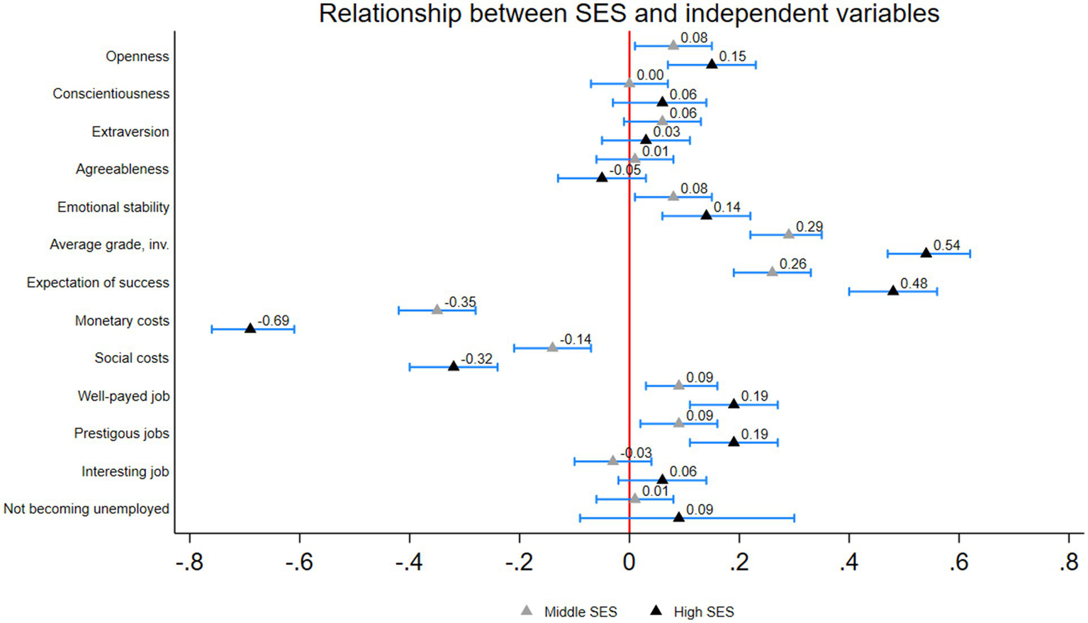 In a first step, we need to observe the bivariate relationship between SES and our independent variables. As elaborated before, this is important for the theoretical interpretation of the effects of personality traits on the study intention. Figure 2 reports the relationship between SES and the independent variables based on bivariate linear regressions of SES on the different variables. For the personality traits, we observe no significant differences between the low SES group and the other two groups for conscientiousness, extraversion and agreeableness. For openness and emotional stability, we observe slightly higher levels for the middle and high SES groups with a difference of 0.08 and 0.15 standard deviations (SD) for openness and 0.08 and 0.14 SD for emotional stability. Considering the variables that measure the primary and secondary effects of social origin, the group differences are in line with the empirical research and our theory. Individuals with a middle and high SES background have higher grades and a higher expectation of success, their expected costs of studying are lower, and their expected benefits are, in general, higher than for individuals from low SES families.