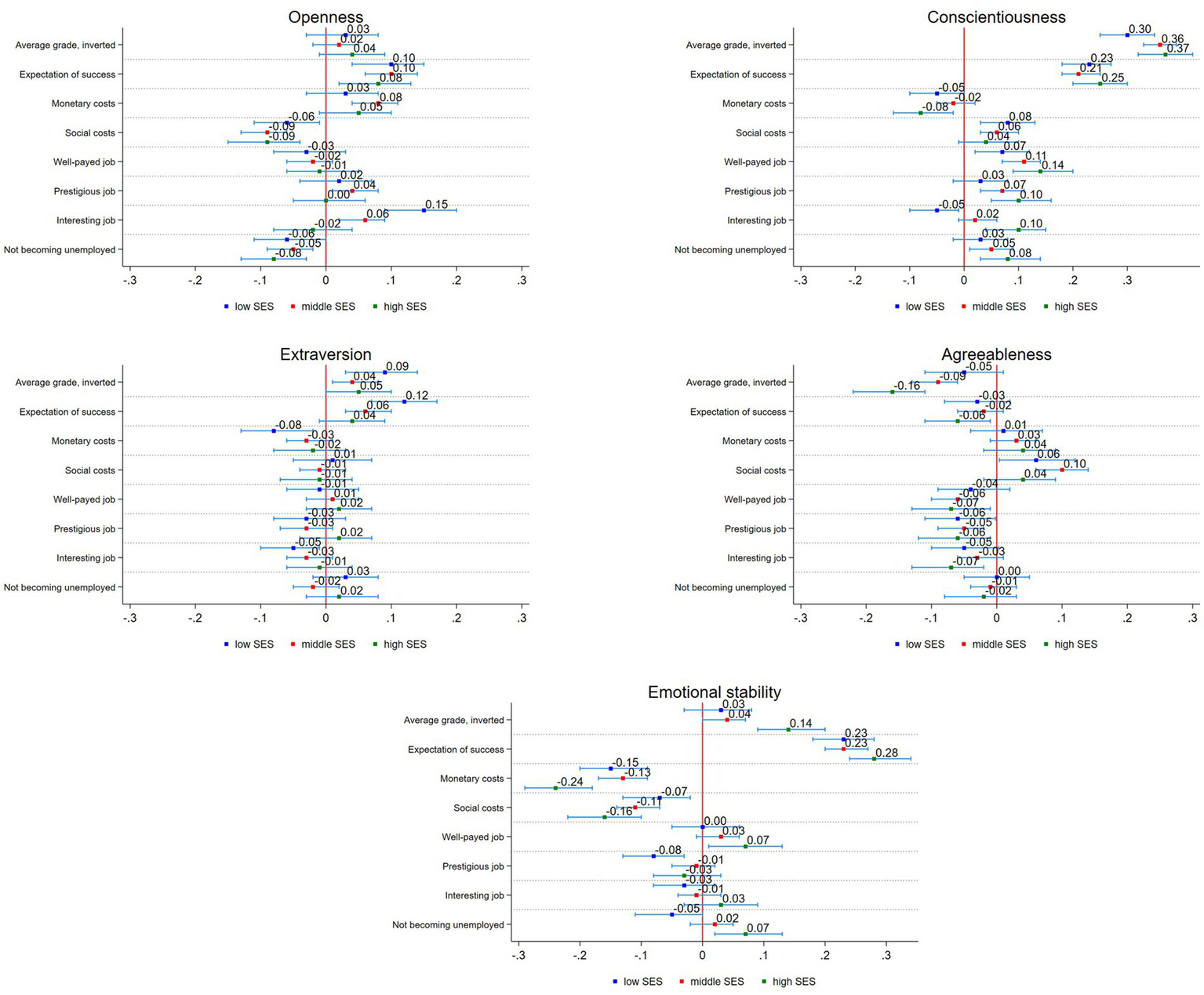 As expected from the literature, we observed positive effects from conscientiousness for all groups on the average grades and the expectation of success. For the average grade, the middle (ß = 0.36) and high (ß = 0.37) group benefit slightly more than individuals with a low SES background (ß = 0.30), while there are almost no differences for the expectations of success (ß ranging between 0.21 and 0.25). Further, we observe lower expected monetary costs for the low (ß = −0.05) and high (ß = −0.08) group and higher expected social costs for the low (ß = 0.08) and middle (ß = 0.06) group. Conscientiousness has a positive effect on the expectation of getting a well-payed job for all groups while the perception of getting a prestigious job only significantly differs for the middle (ß = 0.07) and high (ß = 0.10) SES groups. The same accounts for the expectation of not becoming unemployed after higher education. As for openness, we observe significant differences between the low and high SES group for the expectation of getting an interesting job. While there is a negative effect of conscientiousness for the low SES group (ß = −0.05), it is positive for the high SES group (ß = 0.10).