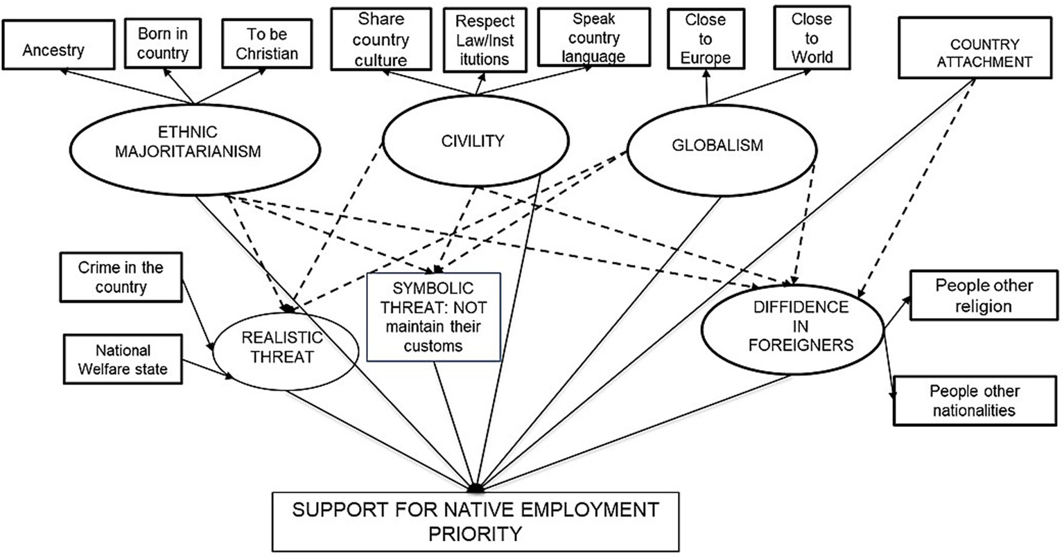 To address these dynamics, this article examines how the ethnic and civic facets of national identity, together with the degree of national attachment, influence support for a specific exclusionary attitude—namely, the belief that, in circumstances of job scarcity, priority should be given to co-nationals—both directly and indirectly, through perceived threat and intergroup distrust.