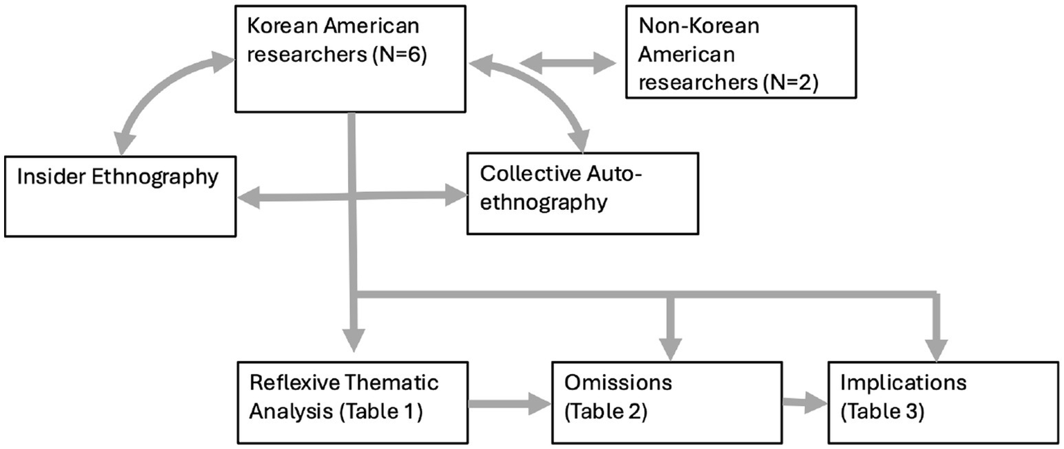 However, we acknowledge that the Korean American experience is multifaceted, and we cannot provide insights that are representative of the entire heterogenous Korean American community. Moreover, we are researchers in academia, and therefore bring a specific view to the subject matter shaped by scholarly discourses surrounding racial discrimination and its impact on health outcomes in marginalized communities. However, our research team consists of members with intersectional experiences in terms of age, gender, immigration history, and acculturation. We reflexively discussed our positionality with two non-Korean American co-authors (one Filipina American, and one Singaporean American), who provided ‘outsider’ perspectives. Figure 2 shows the dialectic between participant and researcher in the analytic process, with participants driving the generation of themes, and with insider/auto-ethnography driving discussion around omissions and research implications.