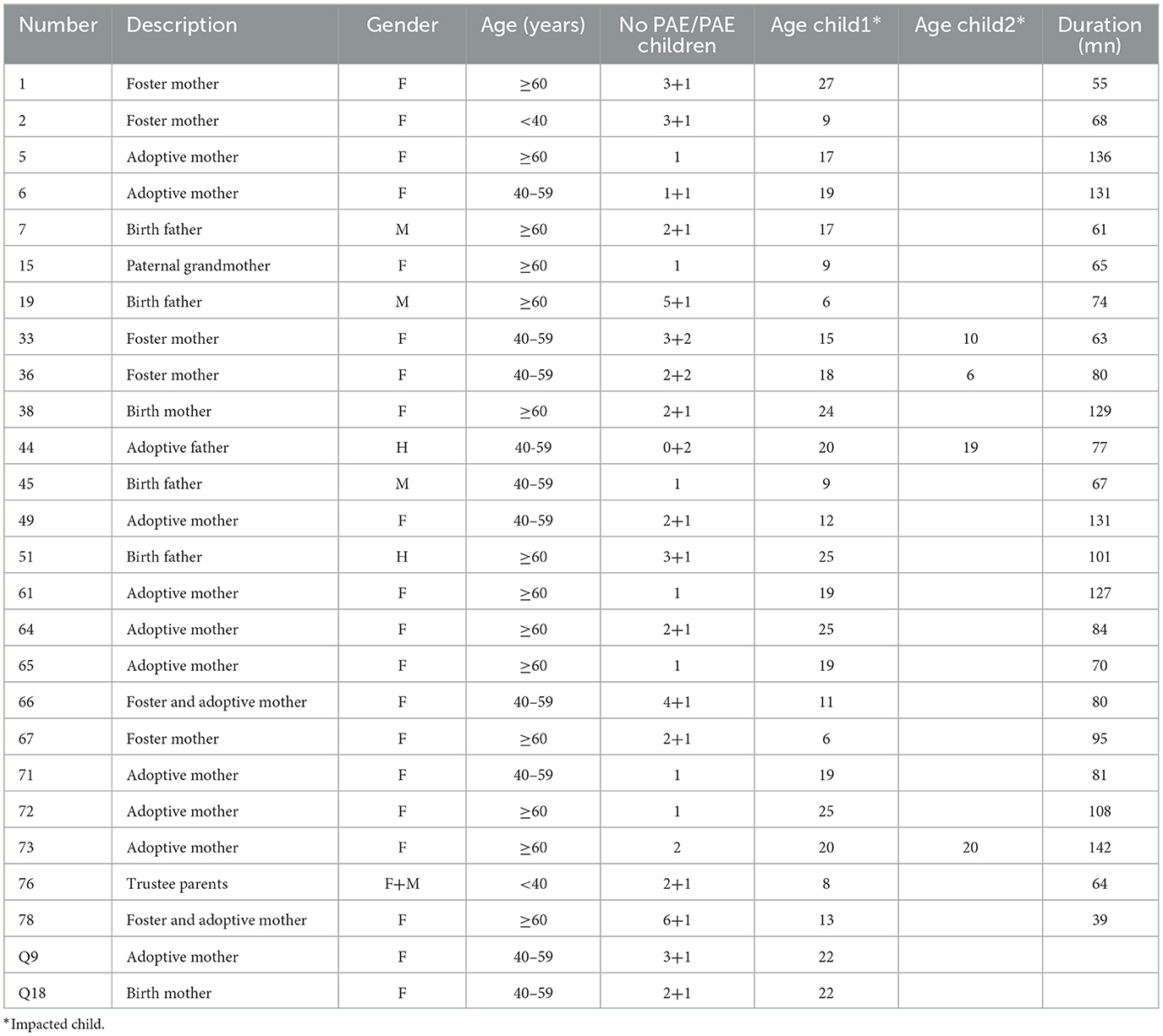 The families interviewed were very diverse in terms of their legal status: biological, adoptive, trustees or foster care by judicial decision. Foster families in France are paid, and those we met provided long-term foster care and identified themselves as parents. The age of the parents ranged from 32 to 68 years. The efforts made to meet fathers allowed the sample to include six fathers, and one couple, out of the 25 biological families. The foster carers were almost exclusively women, except for two, just like adoptive families where two men participated at the same time as their spouses and one alone. In terms of siblings, there was an average of 3 children in total (range 1–9). Most families had a child with FASD, but nine families had two such children and one raised three. The age of the children varied from 1 to 27 years, with an average age of 15 for the first child, 10 for the second and 4 for the third. The families came from all social backgrounds, from senior executives to unemployed women with a very low educational level. Some of the biological and foster families were of minority ethnic origin. The professionals ranged in age from 22 to 75 years and were mostly women (38 out of 53) with an average age of 48 years. Table 1 shows the characteristics of the interviewees whose narratives are quoted in this text.