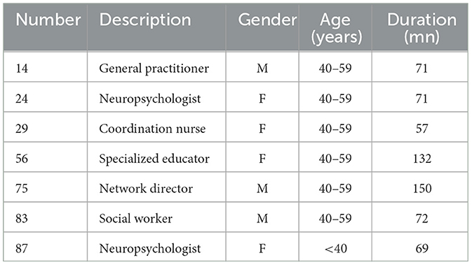 The duration of interviews ranged from 39 min to more than 3 h, mainly depending on the conditions of the meeting (mean duration 81 min). The shortest interviews took place in hospitals, as we had to respect the constraints of the consultation schedules. For this reason, interviews were often 59 min exactly with the professionals. All families and professionals received detailed information and gave their written informed consent to participate in accordance with the terms authorized by the Paris Cité University's ethics committee (CER no. 2023-124). No incentive was provided for participants but the researchers will share the study results with the support groups and medical services. To preserve anonymity, the ages were grouped into large groups (< 40; 40–59; 60+) and the locations not identified.