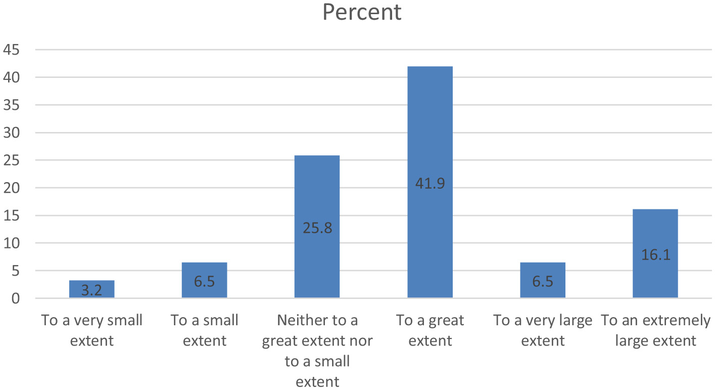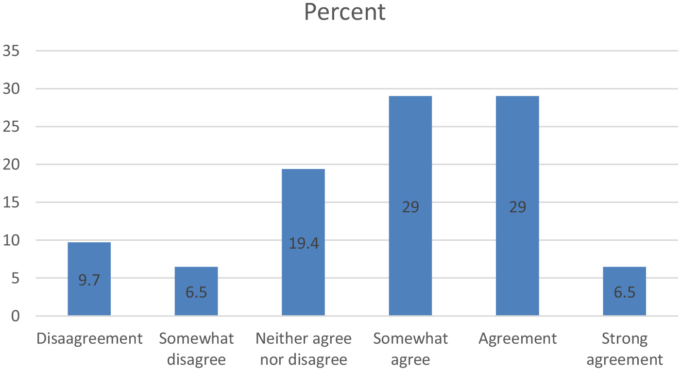 Given life satisfaction, most respondents somewhat agree (29%) and agree (29%) with the statement that their life is close to the ideal they have. A significant percentage of respondents gave neutral answers (19.4%), and 9.7% of them strongly disagreed with this statement (Figure 1). It can thus be said that in general, the majority of Romanians in Florence consider that their life is close to the ideal they have created. Since life satisfaction was measured through a single-item statement, the result should be interpreted with caution regarding reliability. Nevertheless, the finding is consistent with previous studies showing that life satisfaction among migrants increases with time spent in the host country (Kogan and Shen, 2019).