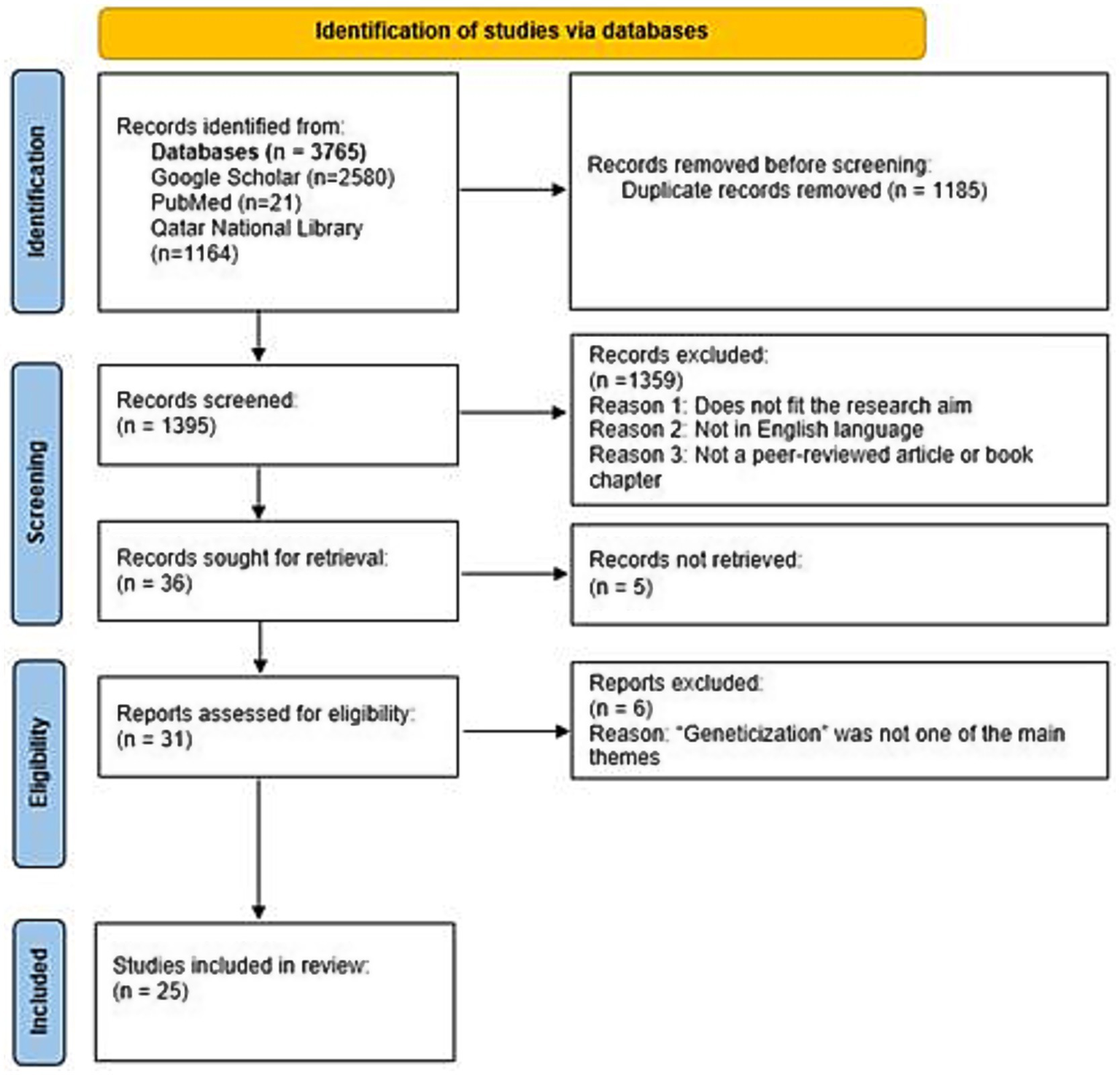 An in-depth and systematic search was carried out across several electronic databases, including PubMed, Google Scholar, and digital collections accessible through the Qatar National Library. The search aimed to capture all relevant literature from January 2011 to December 2024. The terms used in the search strategy included the keyword variants: “geneticization” OR “geneticisation,” as both spellings are used interchangeably in the literature. These search terms were applied to the titles, abstracts, and keywords of articles to ensure comprehensive coverage. The search terms were used consistently across all databases utilized for the study.
