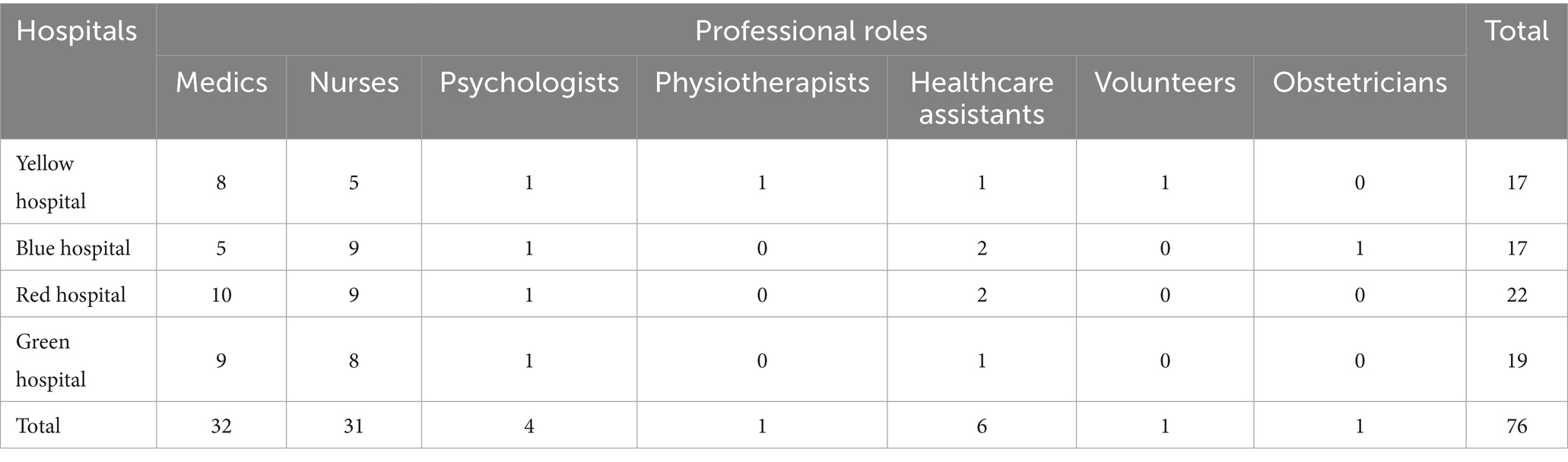 The Table 1 summarises the distribution of interviewees by professional role and hospital.