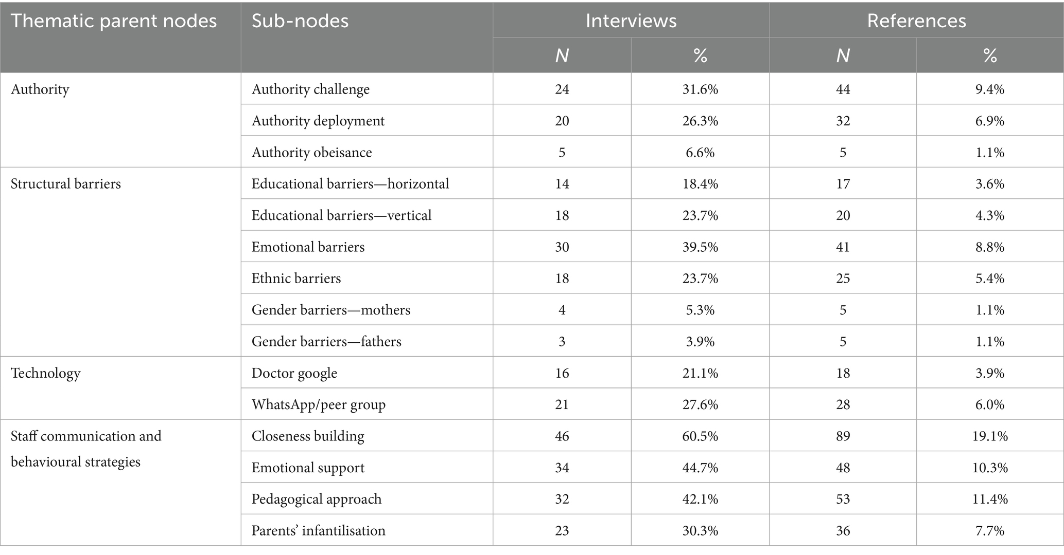 The most frequently referenced codes concern Staff communication strategies, particularly closeness building (89 references) and emotional support (48), followed by themes related to the pedagogical approach (53) and parents’ infantilisation (36). Codes related to Authority and Structural barriers were also widely represented, with multiple sub-nodes distributed across a substantial number of interviews. In contrast, gender-specific barriers appeared less frequently, suggesting either lower salience or less direct expression by participants.