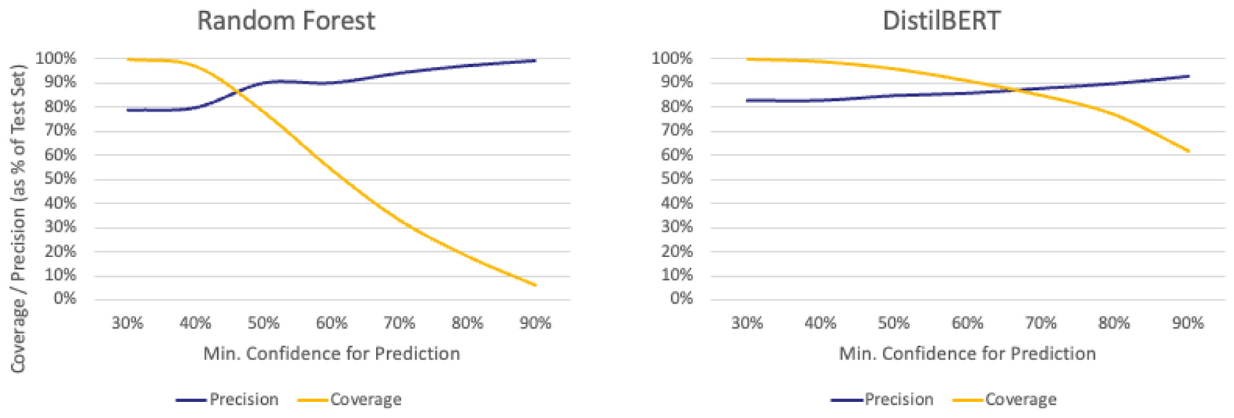 When applied to the full test set without abstention, both machine learning models outperform the baseline. DistilBERT achieved the highest overall performance (Precision = 83%, Recall = 82%, F1 = 82%), followed by Random Forest (Precision = 79%, Recall = 78%, F1 = 78%), compared to the baseline's lower scores (Precision = 70%, Recall = 64%, F1 = 66%). See Table 2 for a performance breakdown.